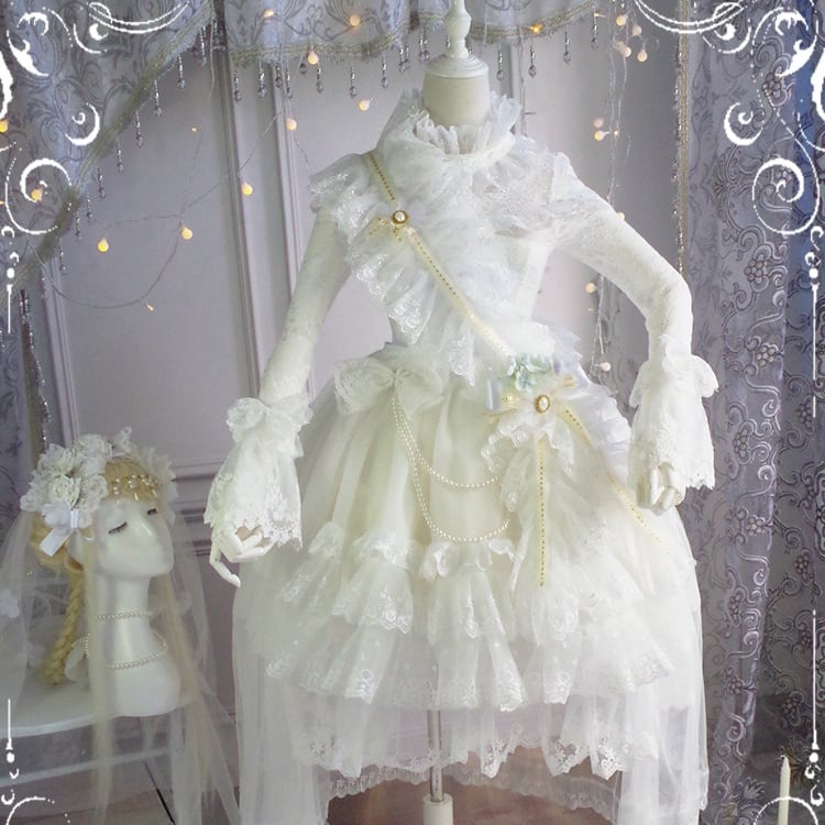 上品なホワイトロリータのJSKにはアンティーク調のフェイクパールが飾られ、女性らしいエレガントな印象を与えます。それに加え、ウエストベルト、ネックレス、スカートカバーもセットになっており、コーディネートを考える手間が省けます。