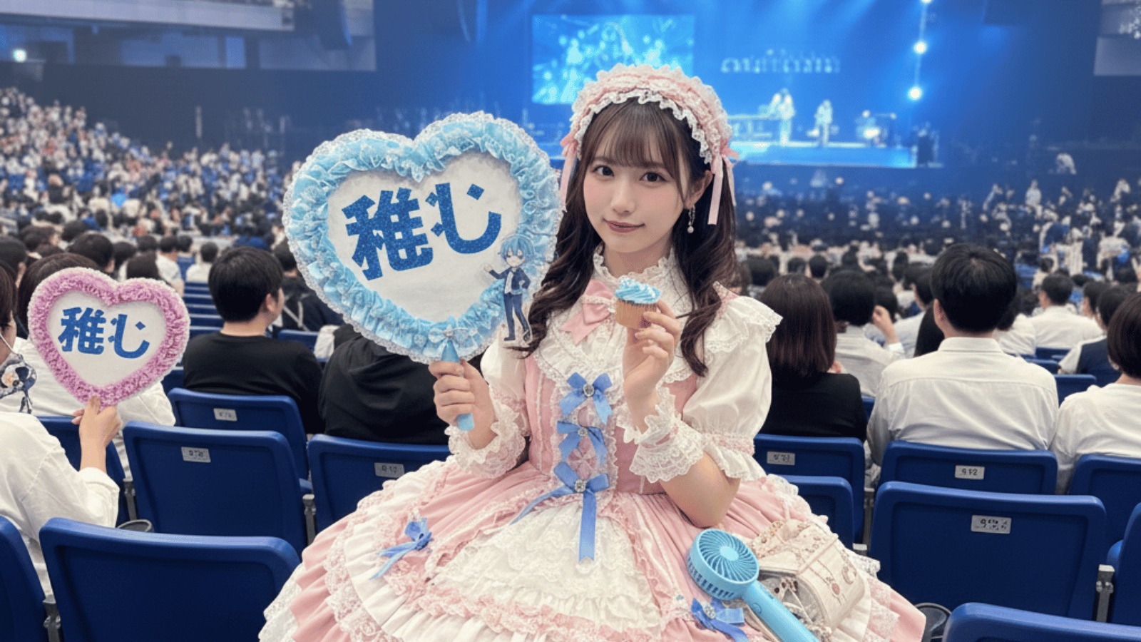 うちわ・アクリルスタンドを推しカラーに合わせてコーデに取り入れると、統一感のある参戦スタイルになります。甘ロリ・ゴスロリなどジャンルを推しの世界観と合わせるのも楽しみ方の一つです。