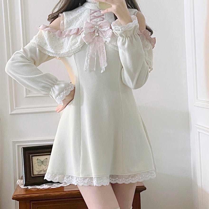 SEASONZ 夢かわいい 量産型 ワンピース リボン オフショル ケープ風 レイヤード ガーリーファッション 甘め 原宿ファッション