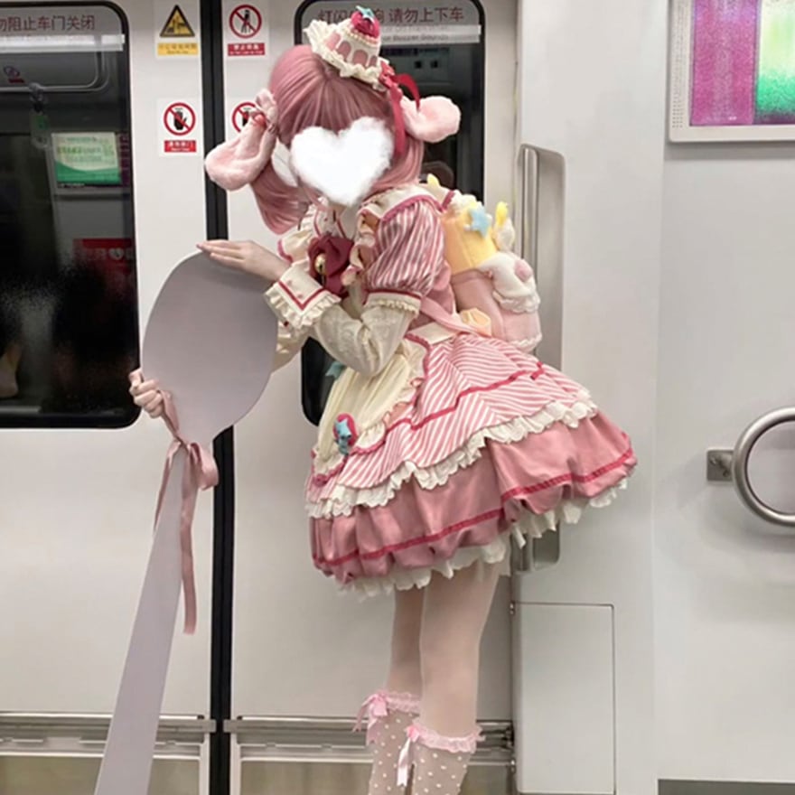 SEASONZ 甘ロリ ワンピース 長袖 リボン 鈴 ストライプ柄 バルーンスカート プリンセス メイドワンピ イベント コスプレ衣装