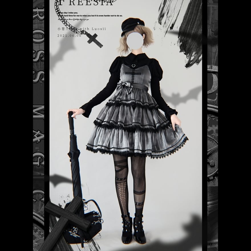 胸元の十字架がダークゴシックな雰囲気のゴスロリ系ジャンパースカートです。