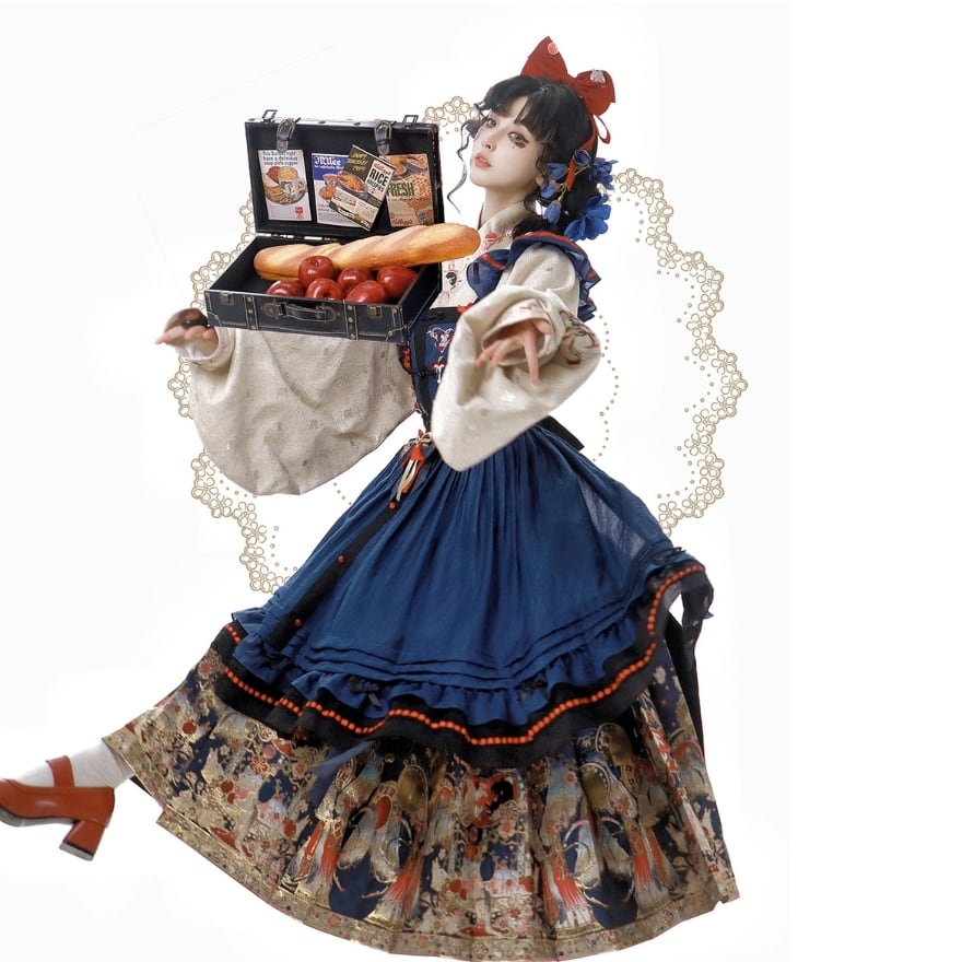 SEASONZ 中華ロリータ チャイナ風 ラップスカート プリーツスカート チャイナ服 中華ボタン 刺繍 バルーンスリーブ 着物風