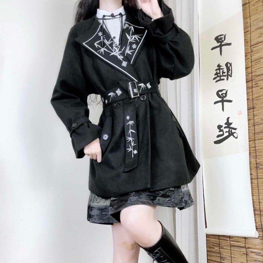 モダンチャイニーズな雰囲気が漂う、竹刺繍ベルト付きコートです。