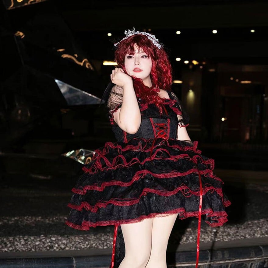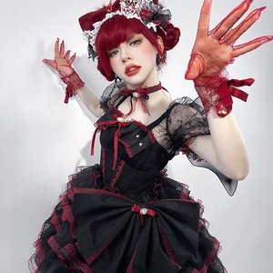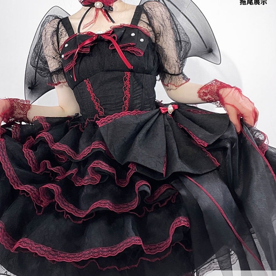 黒と赤のコントラストが美しい、ゴシックロリータ レイヤードドレス。