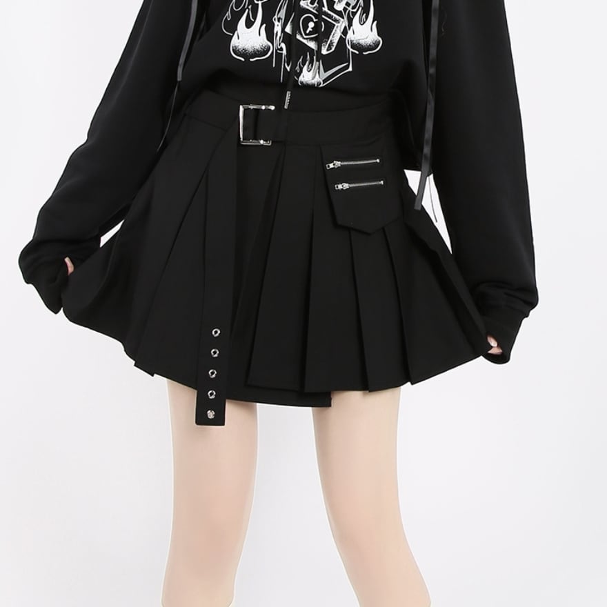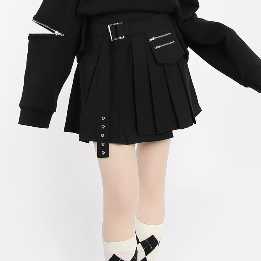 漆黒の生地に、プリーツ、ベルト、シルバーの金具、そしてジッパー付きのポケットが配された、ロリータパンク風ミニスカート。