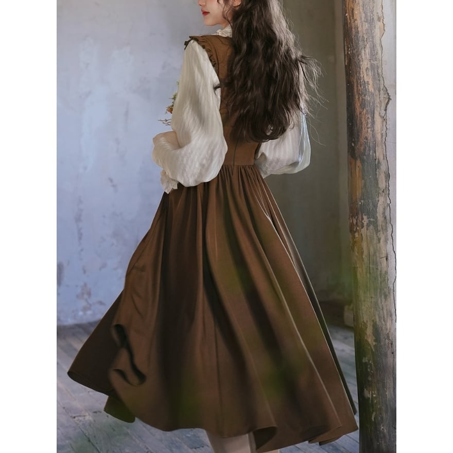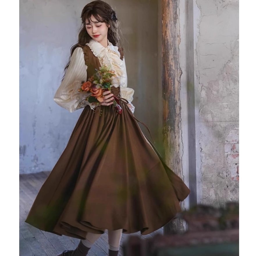 深みのあるブラウンカラーの生地に、繊細なフリルが施されたブラウスと、コルセット風のデザインが特徴的なジャンパースカートのセットアップ。