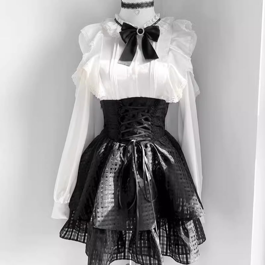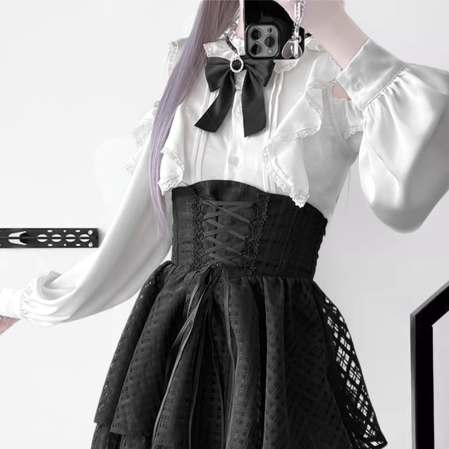 白いブラウスに、編み上げデザインのコルセット風トップス、そしてフリルがたっぷりの黒いスカートがセットになった、地雷系ファッションの甘辛MIXスタイル。可愛らしさとダークな雰囲気が同居する、個性的なコーディネートです。