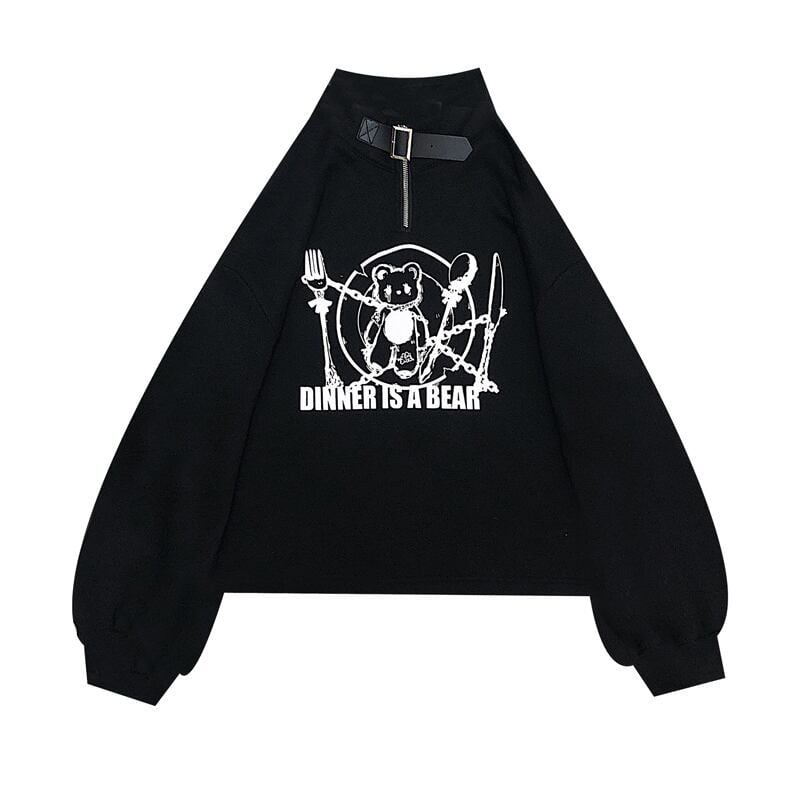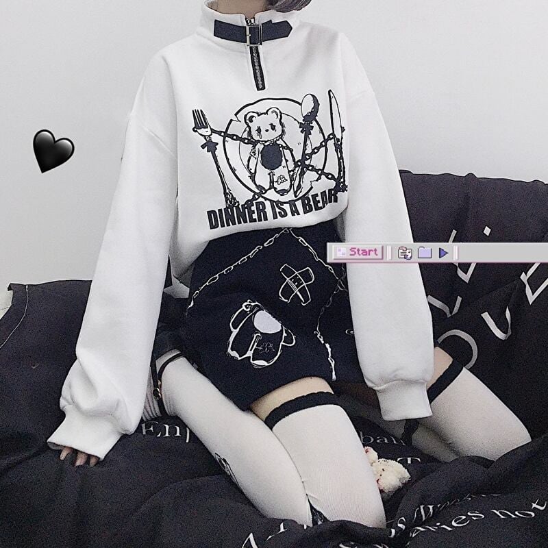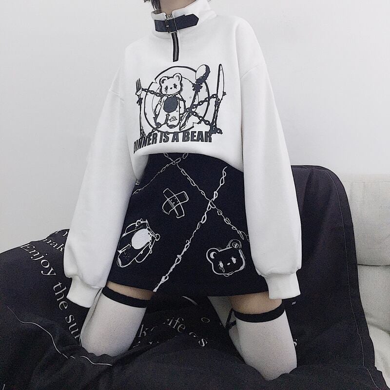 胸元には、チェーンやナイフ、拘束されたクマのイラストと英文のプリントが施されています。