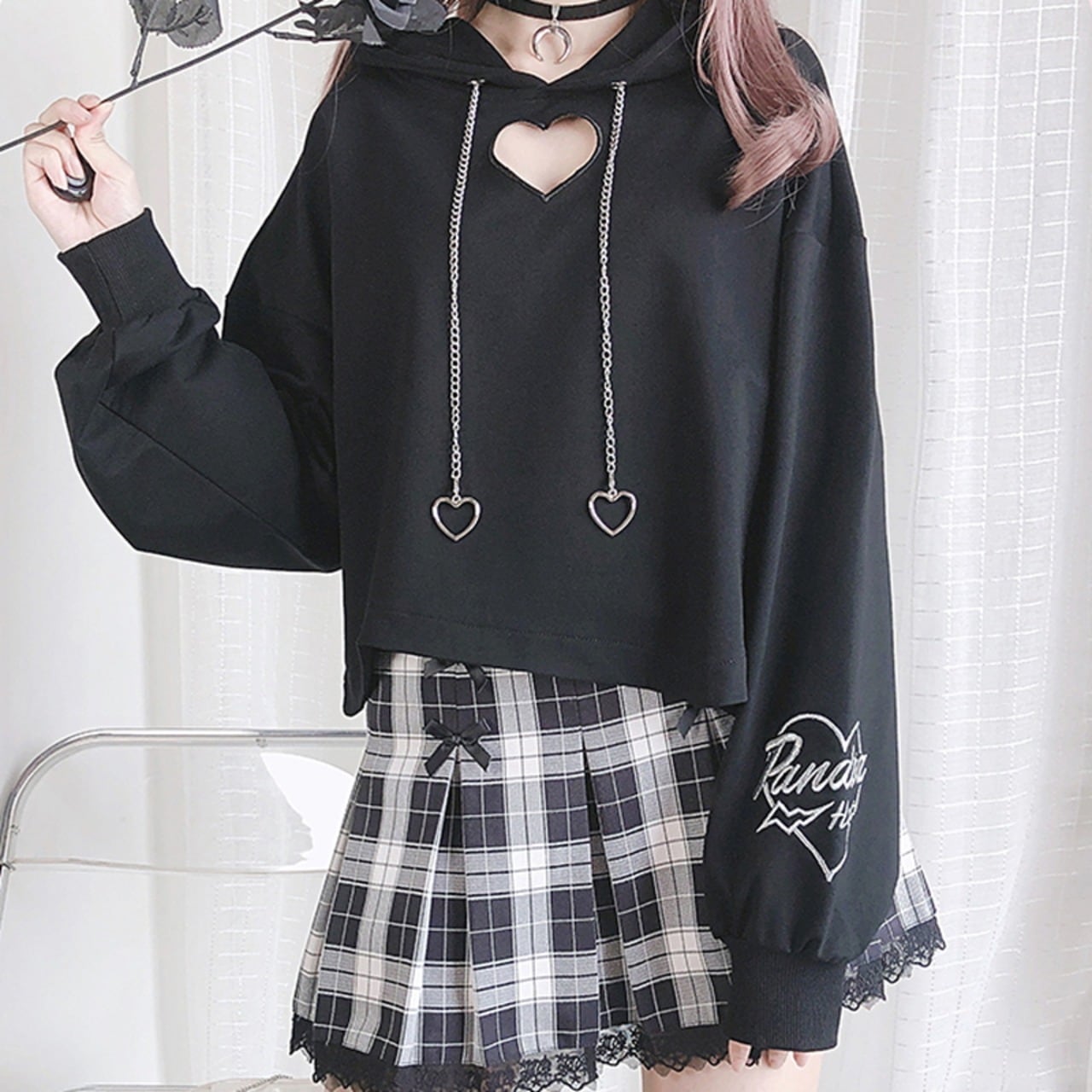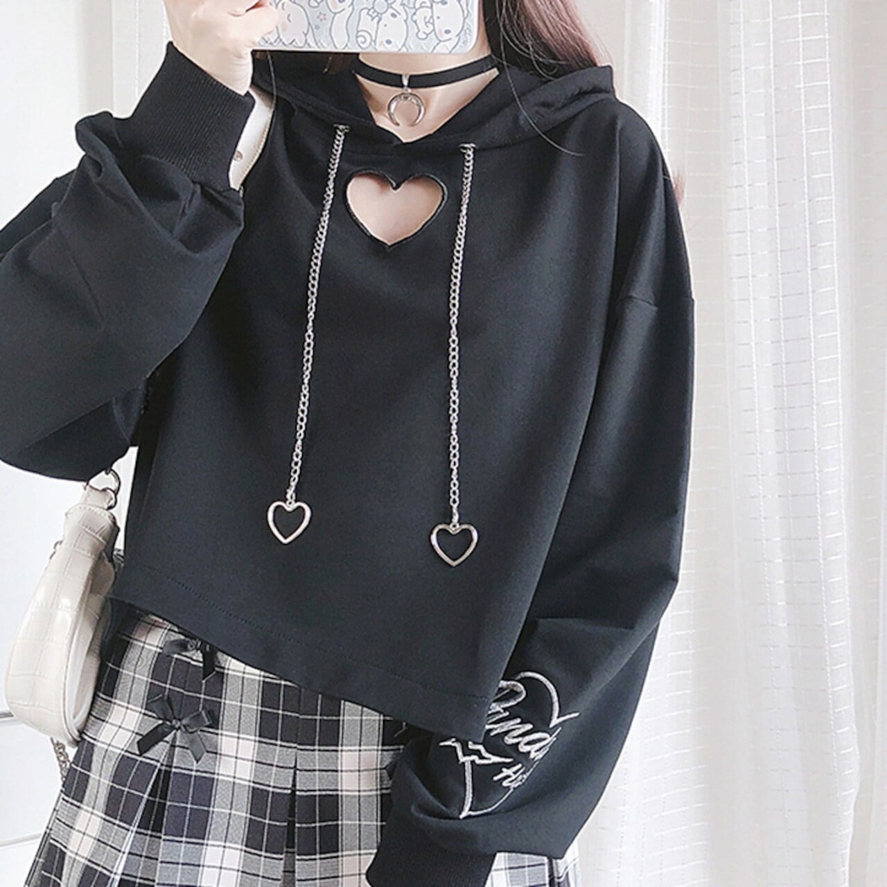 フードの縁はカットオフのデザインで、首元にはハート型のくり抜きがあります。くり抜きからはシルバーのチェーンが垂れ下がり、先端には小さなハート型のチャームが付いています。