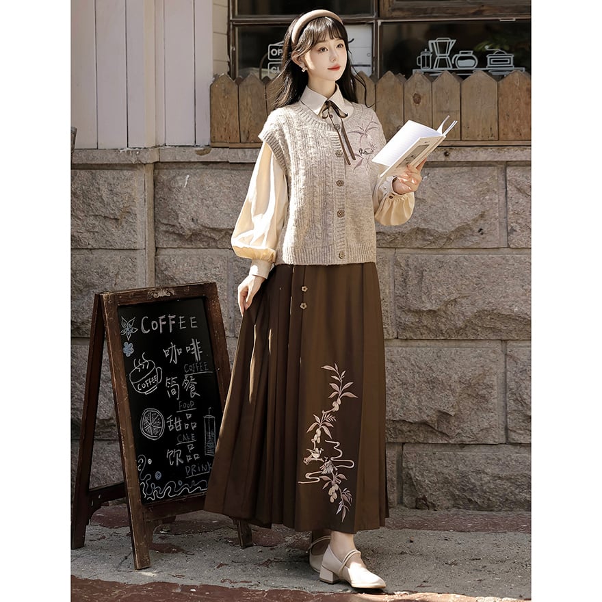 ふんわりとした袖のブラウスに、刺繍が施されたニットベストを重ねることで、奥行きのあるおしゃれなスタイルが完成します。