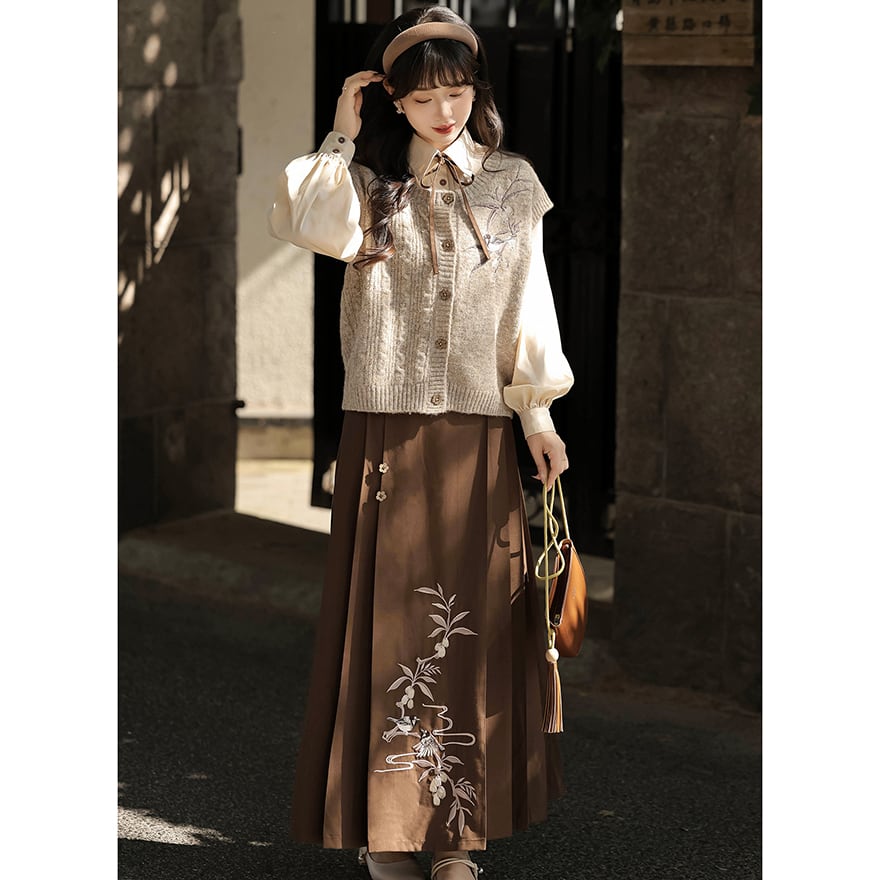 穏やかな色合いと、繊細な刺繍が魅力的な中華風セットアップです。ブラウス、ベスト、スカートの三点がセットになっており、上品で落ち着いた雰囲気 (ふんいき) を演出します。
