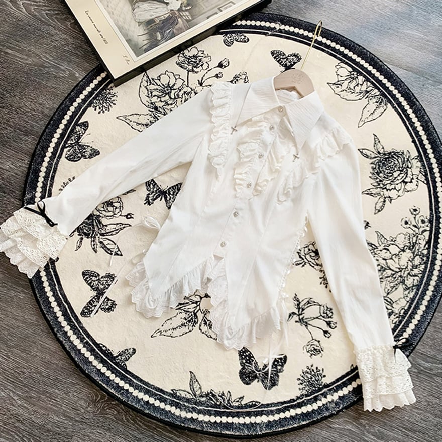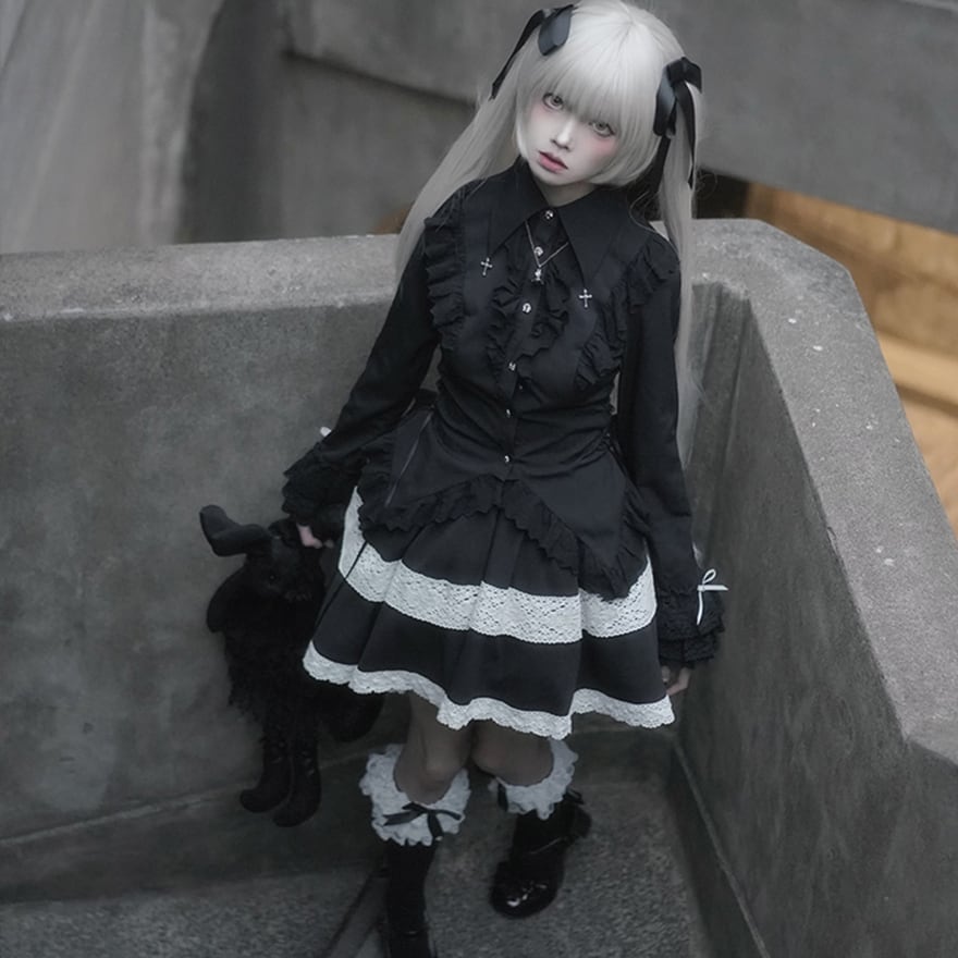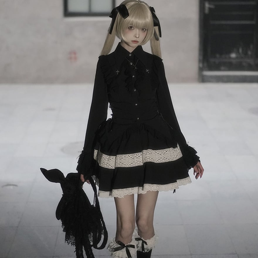 襟に付いた十字架チャームとフリルが可愛い長袖ブラウスです。