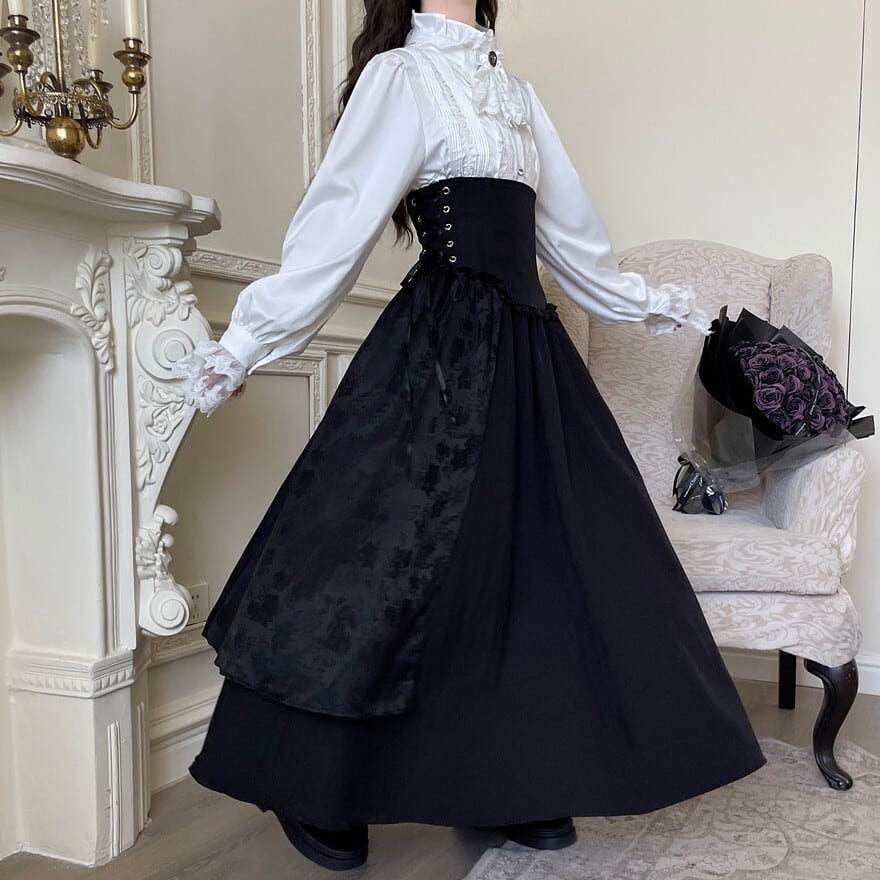 深みのある黒色のスカートとケープに、繊細なフリルとレースが美しいブラウスを合わせることで、統一感がありながらもそれぞれのアイテムの魅力が際立つコーディネートです。