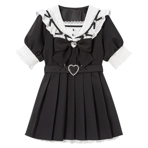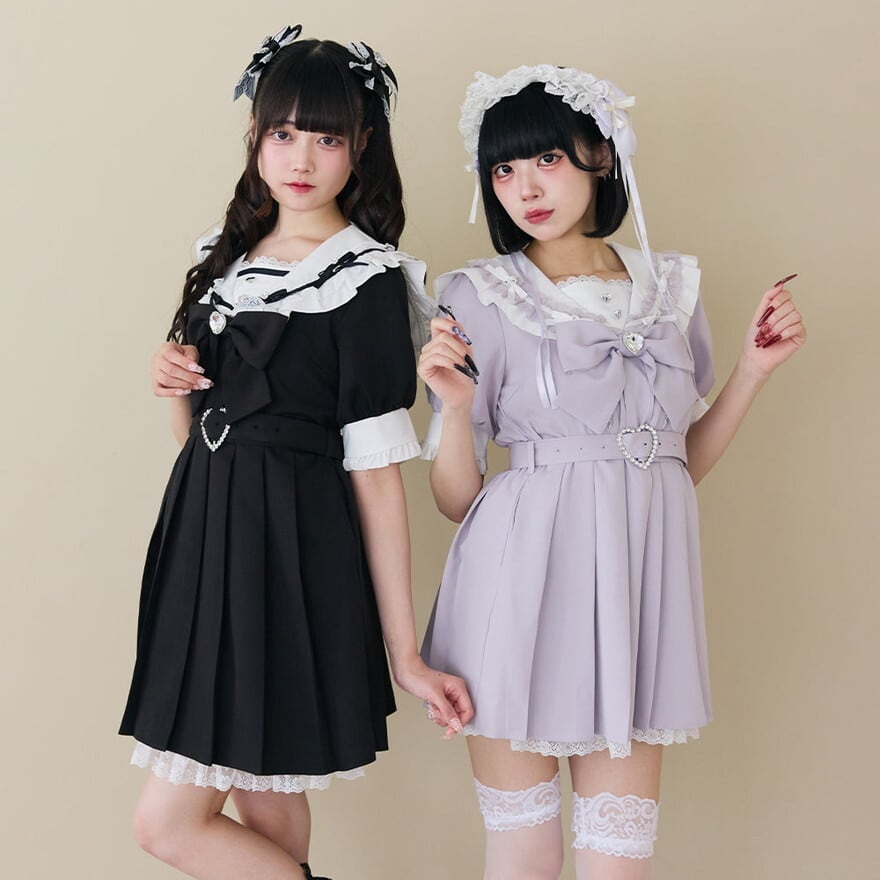フリルとレースがあしらわれたセーラーカラーが顔周りを可憐に飾り、胸元の大きなリボンと、キラリと輝くハートのバックルが付いたベルトが、とびきりの甘さをプラスします。