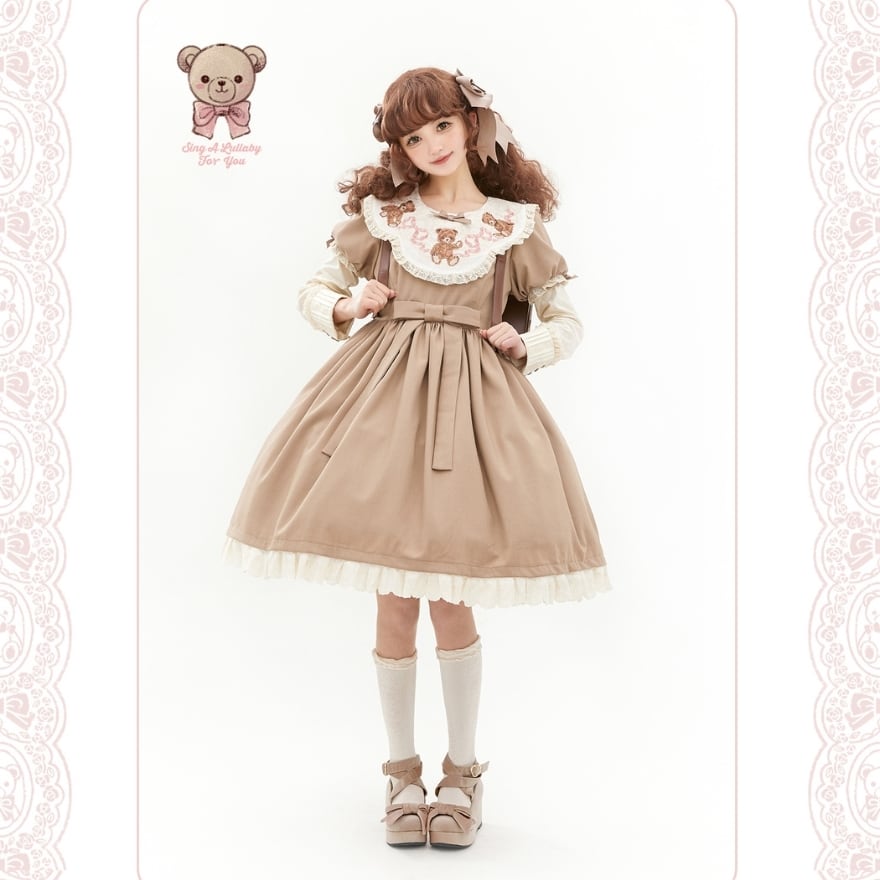 優しいブラウン系の2色展開が魅力のワンピース。丸襟には愛らしいクマさんの刺繍とフリル、レースがあしらわれ、とびきりキュートな胸元を演出します。きゅっと絞れるウエストからふんわりと広がるスカートのシルエットが美しく、裾のレースがさらに甘さをプラス。