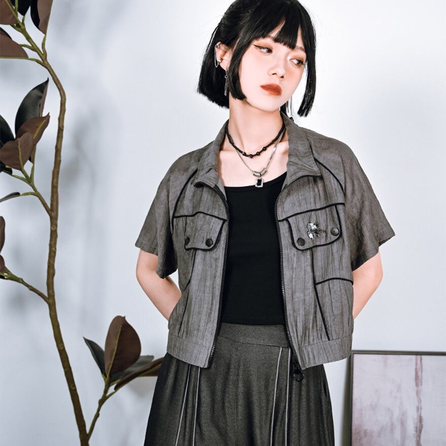 関連キーワード: #チャイナ風 #トップス #半袖 #ジャケット #ショート丈 #グレー #黒 #パイピング #個性的 #サブカル #ストリート #春夏 #羽織り #カジュアル #オリエンタル