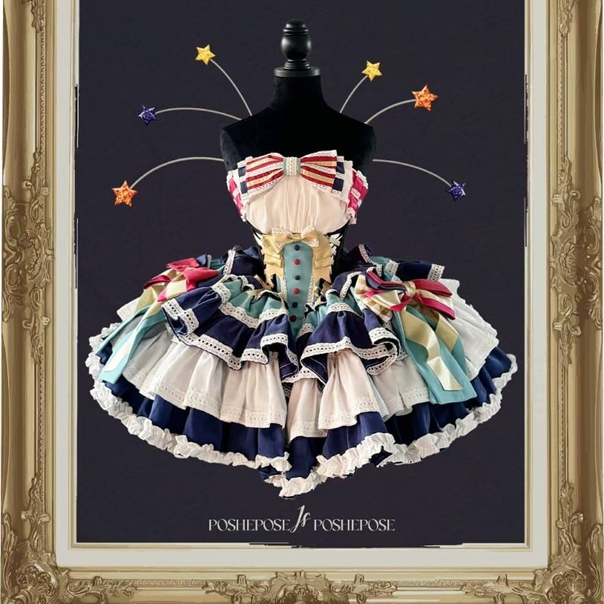 まるで夢の中のお姫様!ふんわりシルエットと胸元の大きなリボンが、一瞬であなたをロマンティックなヒロインに変身させるベアトップフレアワンピースです。ネイビーブルーを基調とした中に、パステルブルーやイエロー、レッドのストライプが遊び心をプラス。