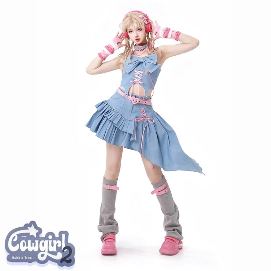 デニム素材をベースに、大胆なレースアップデザインと大きなリボンが目を引く、個性的なセットアップです。