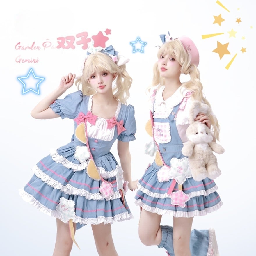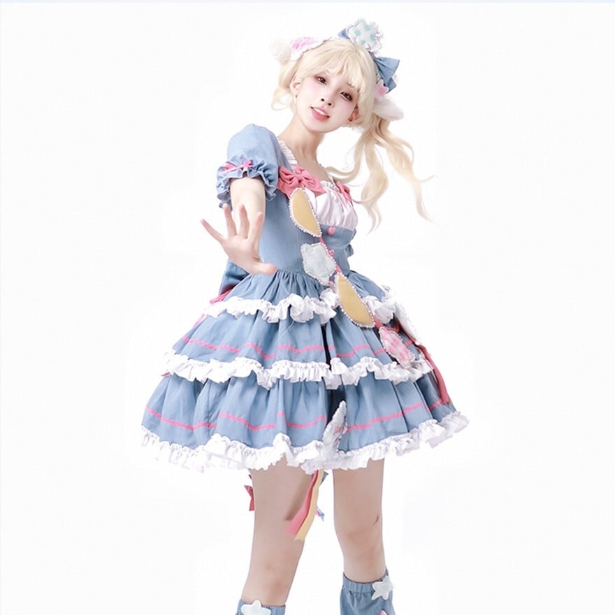 まるで夢の中のガーデンパーティーのような、ロマンティックな半袖ワンピースです。淡いブルーの生地に、ふんわりとしたパフスリーブと、胸元の大きなピンクのボウタイが、可憐な印象を与えます。スカート部分には、幾重にも重なったフリルと、可愛らしいパッチワーク風のデザインが施され、歩くたびに優雅に揺らめきます。ピンクのピコットレースが、さらに甘さをプラス。このワンピースを身にまとえば、どこへ行っても注目の的になること間違いなしです。