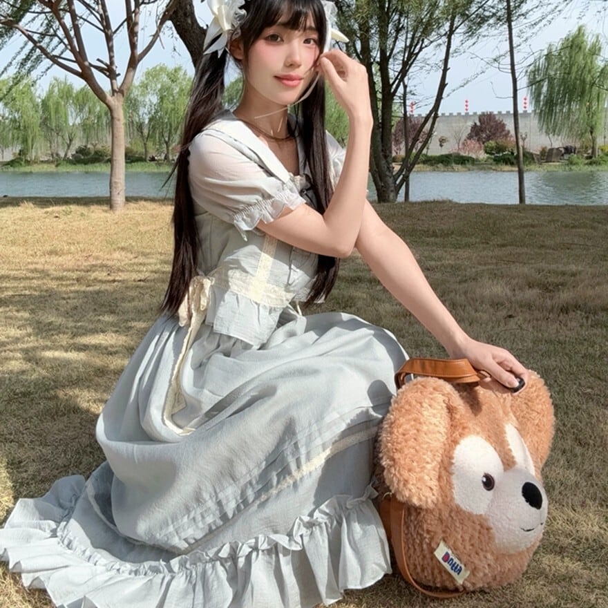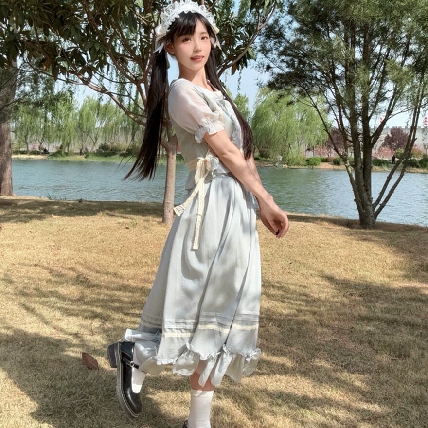 淡い霧のようなブルーが、夢見る乙女心を優しく包み込むロングスカート。繊細なレースの装飾と、ふんわりと広がるシルエットが、まるで絵本から飛び出したような可憐さを演出します。