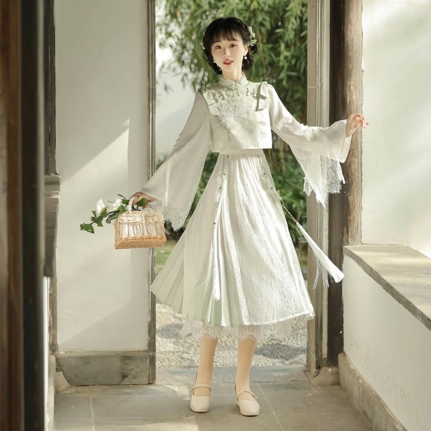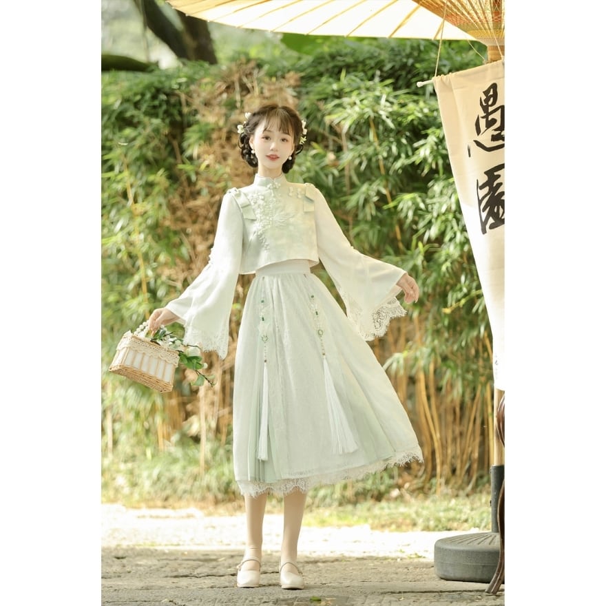 優美なシルエットが魅力の、チャイナ風セットアップ(トップス、スカート)です。