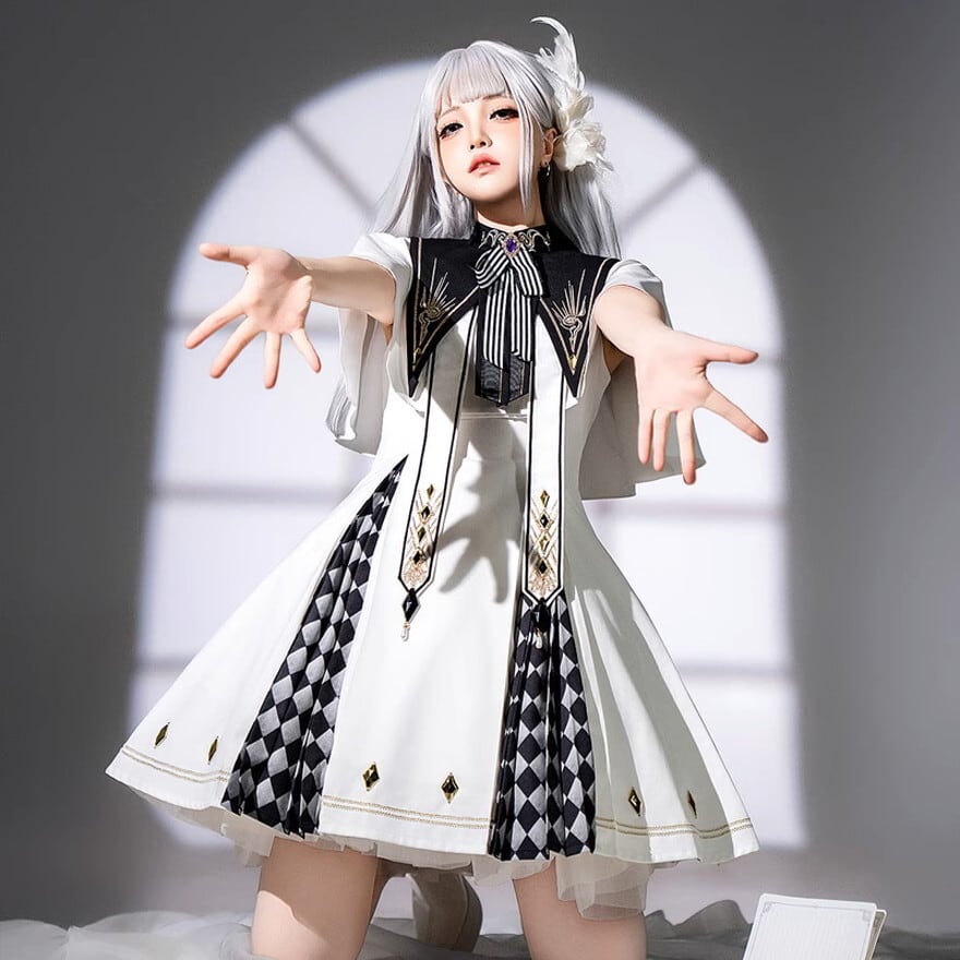 そして、黒と白のアーガイルが目を引くサスペンダースカートは、広がるシルエットと裾の刺繍装飾が、ゴシックな世界観を盛り上げます。
