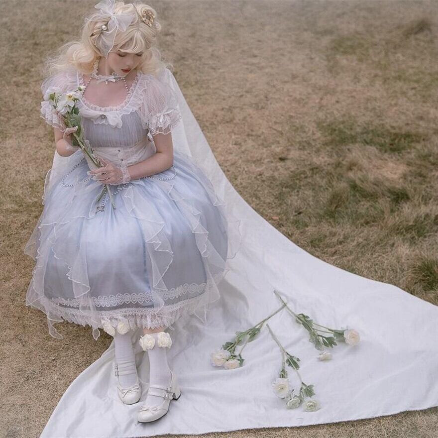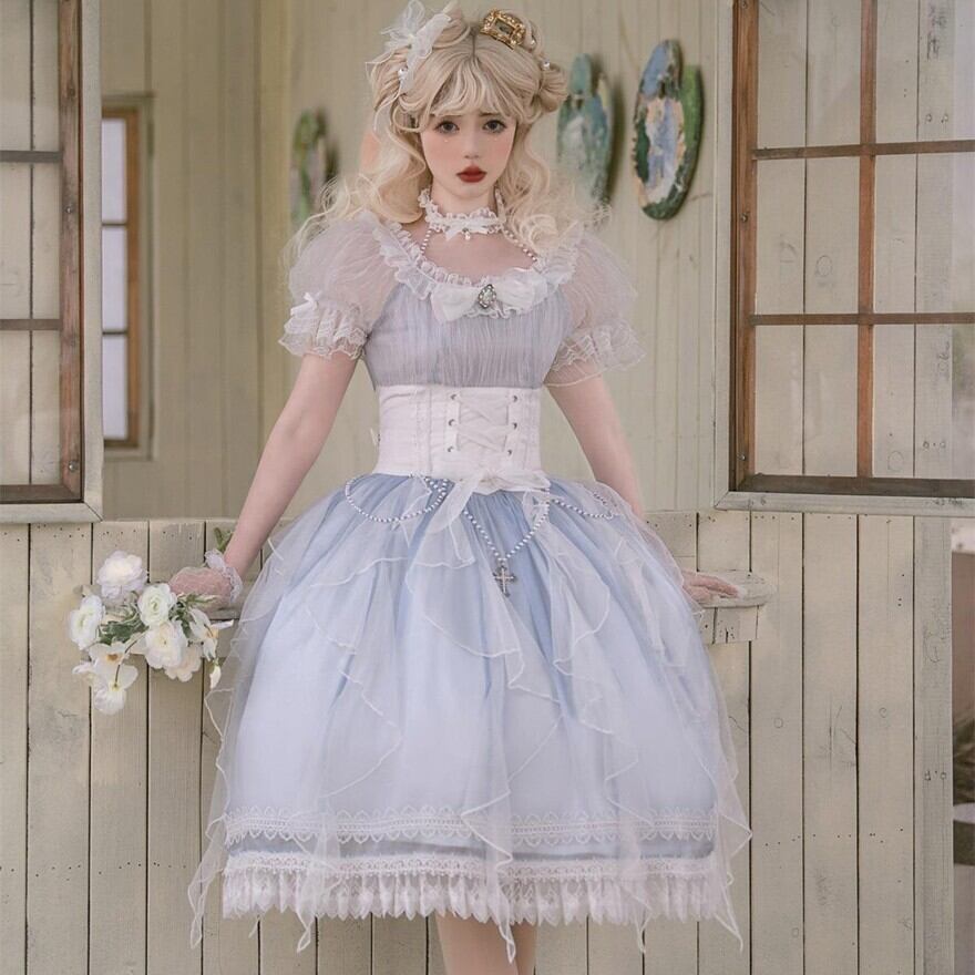 淡いブルーグレーのグラデーションが、まるで夢の中の景色のようなロリィタワンピースです。