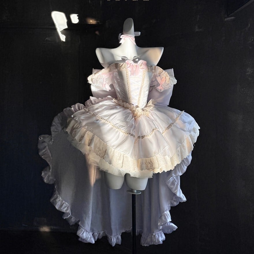 まるで淡い夢のような、オフホワイトとパステルピンクの色合いがロマンティックなロリィタドレスです。コルセット風のデザインがウエストラインを美しく見せ、ふんわりと広がるスカートと、たっぷりのフリルが、まるで舞踏会のお姫様のような華やかさを演出します。肩のフリルや、胸元のリボン、そして裾の繊細なレースが、乙女心をくすぐるポイント。特別な日に、とびきりスイートなあなたを演出してくれる一着です。
