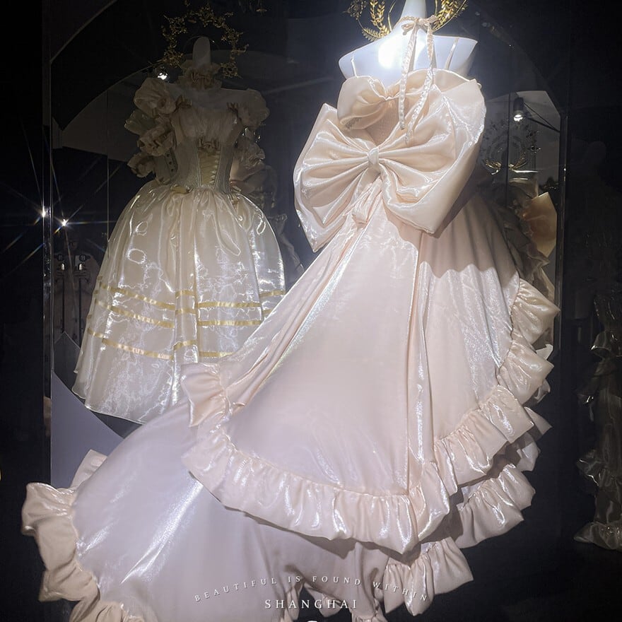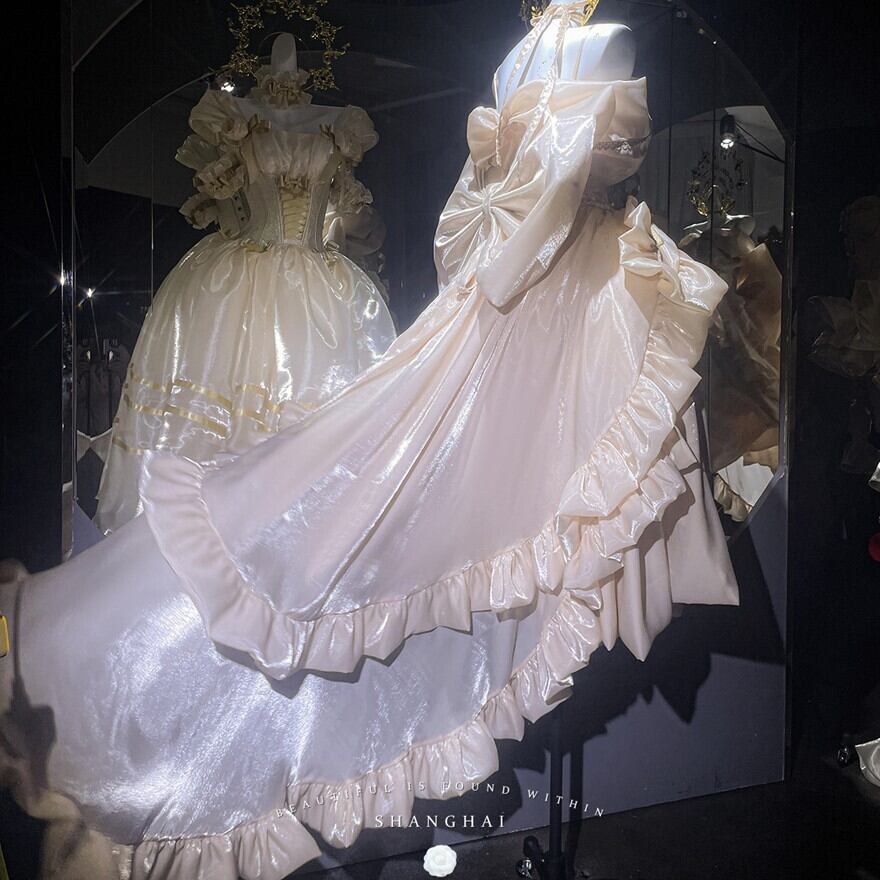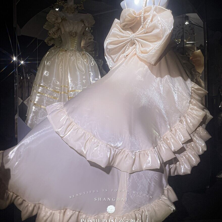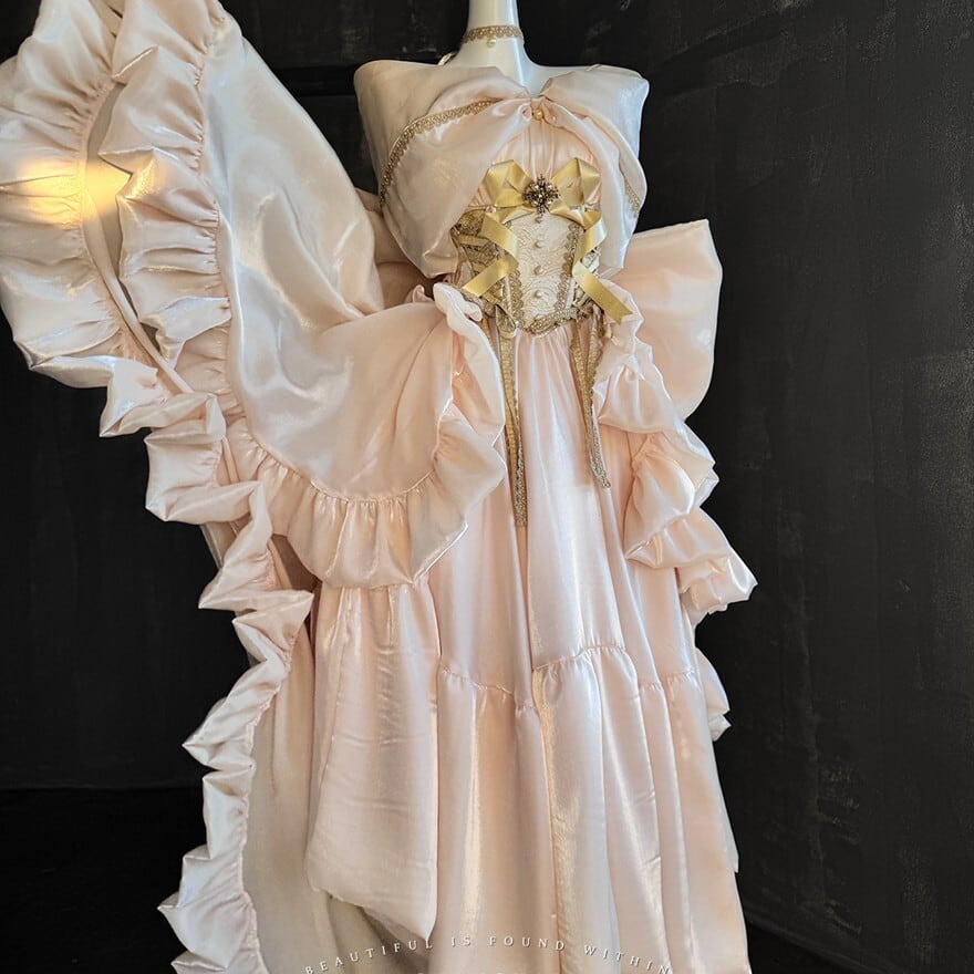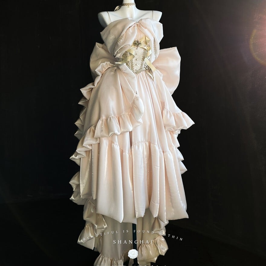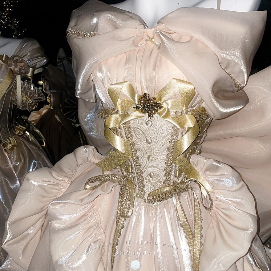 淡いシャンパンゴールドの光沢が、まるで夢の中のドレスのようなロリィタドレスです。大胆なバックリボンとふんわりとしたシルエットが、後ろ姿まで印象的に演出。繊細なレースと胸元の装飾が、上品でクラシカルな雰囲気を醸し出します。特別な日に、あなたを最高に輝かせる一着です。