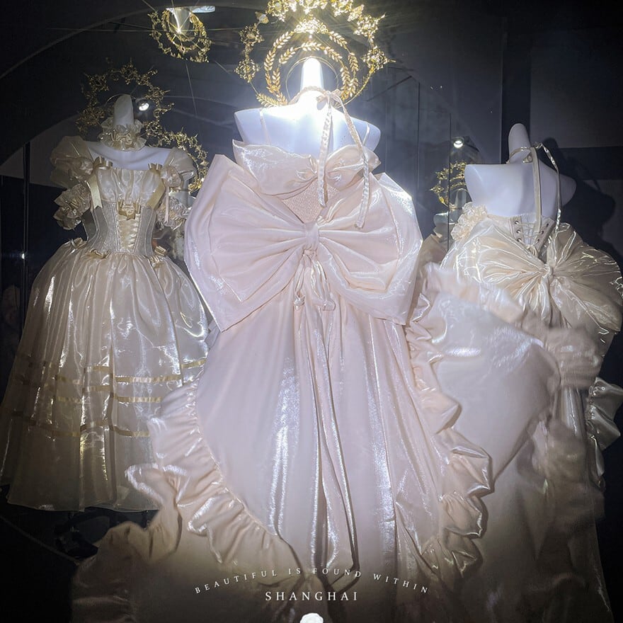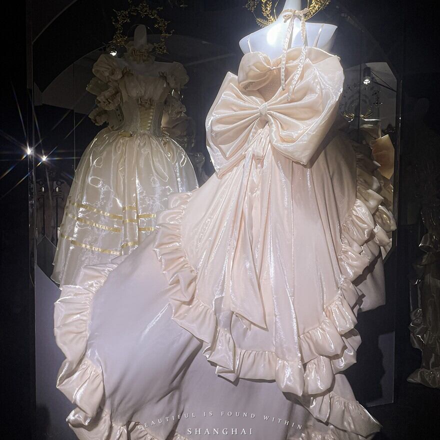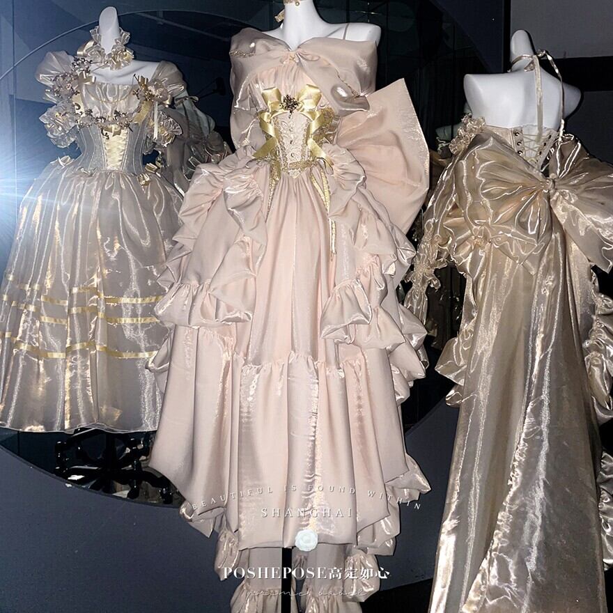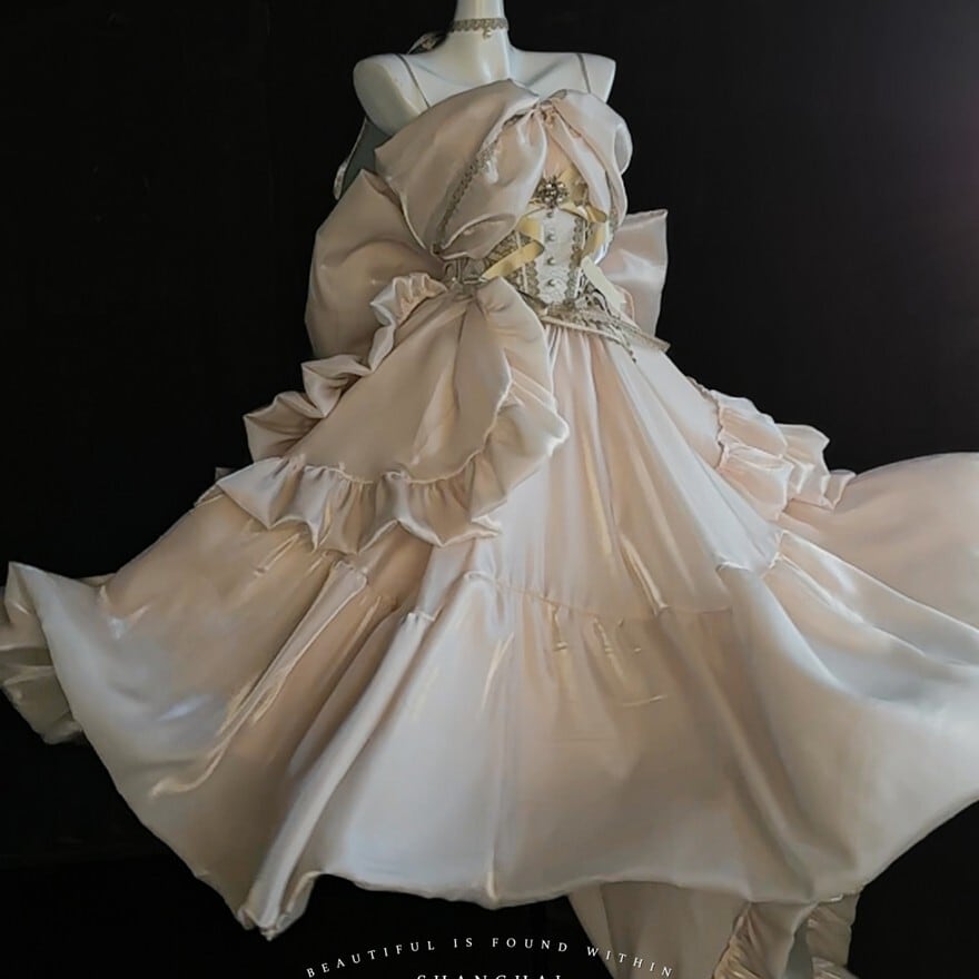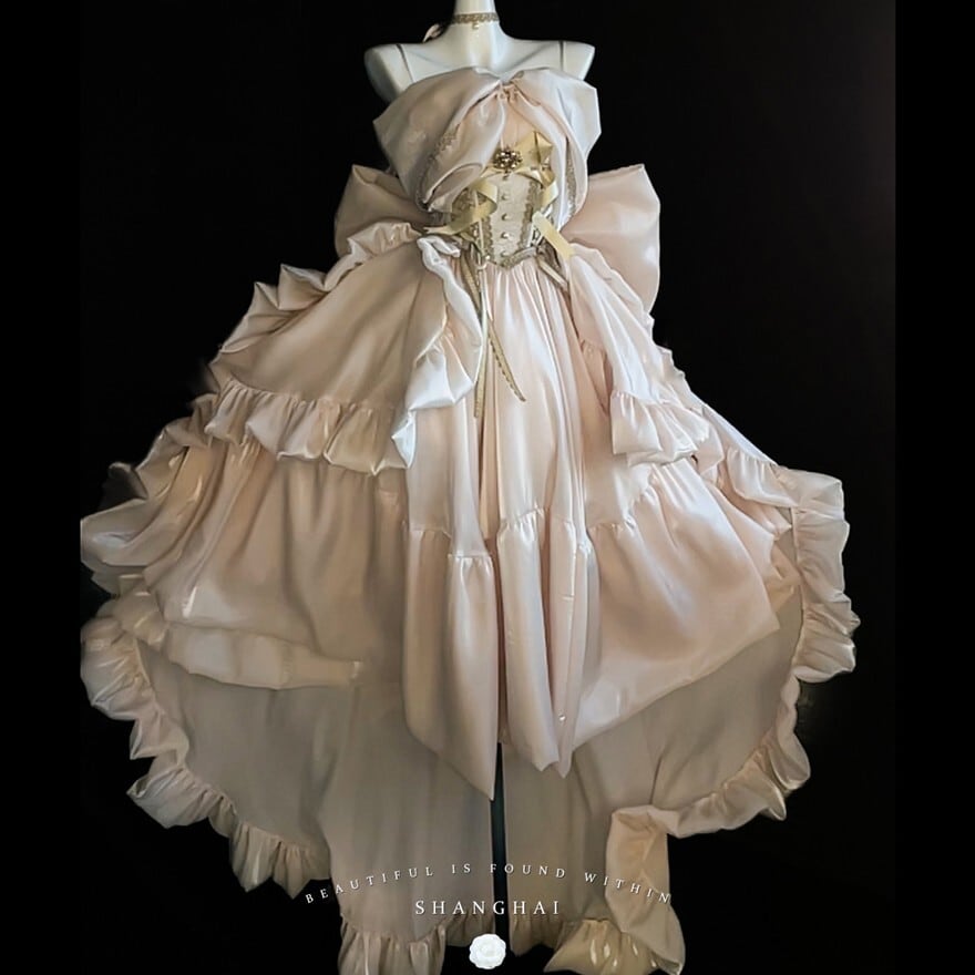 淡いシャンパンゴールドの光沢が、まるで夢の中のドレスのようなロリィタドレスです。大胆なバックリボンとふんわりとしたシルエットが、後ろ姿まで印象的に演出。繊細なレースと胸元の装飾が、上品でクラシカルな雰囲気を醸し出します。特別な日に、あなたを最高に輝かせる一着です。
