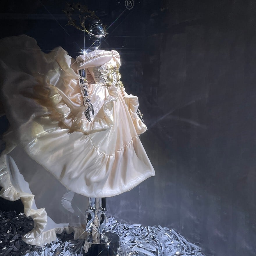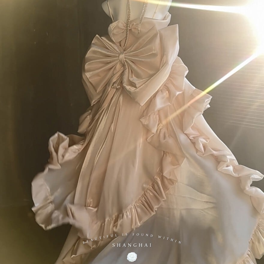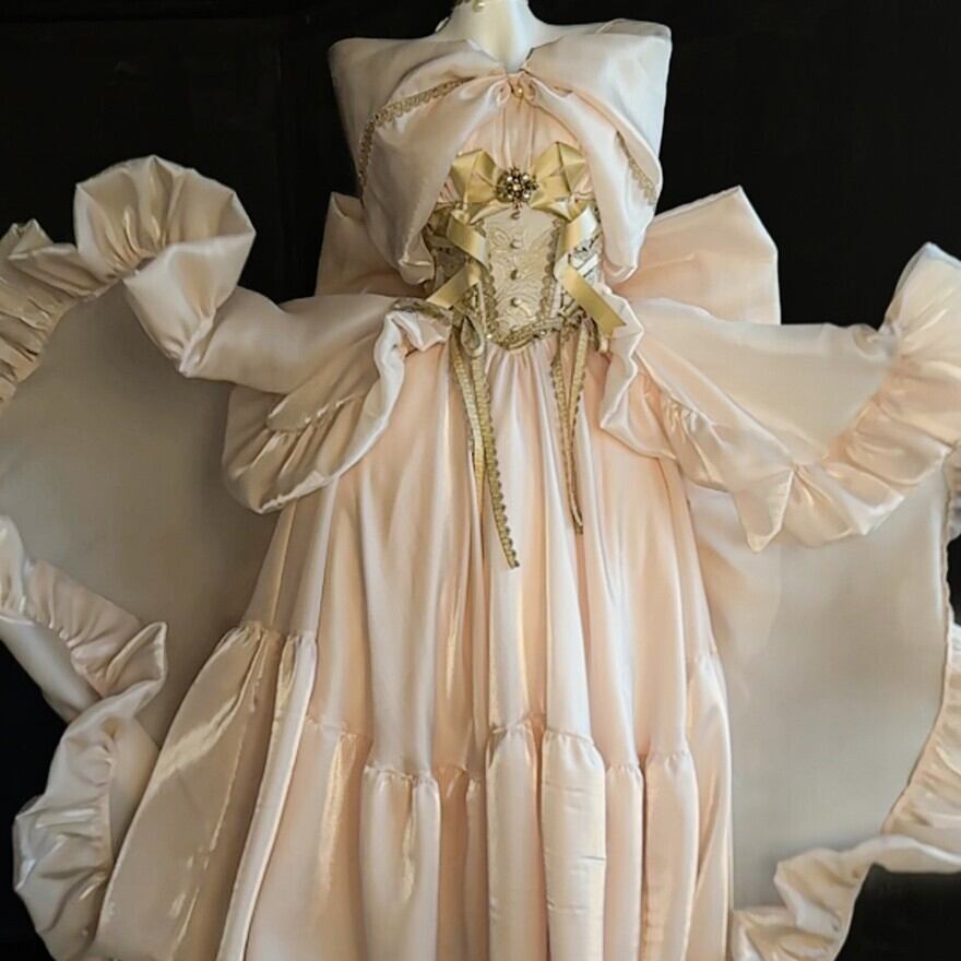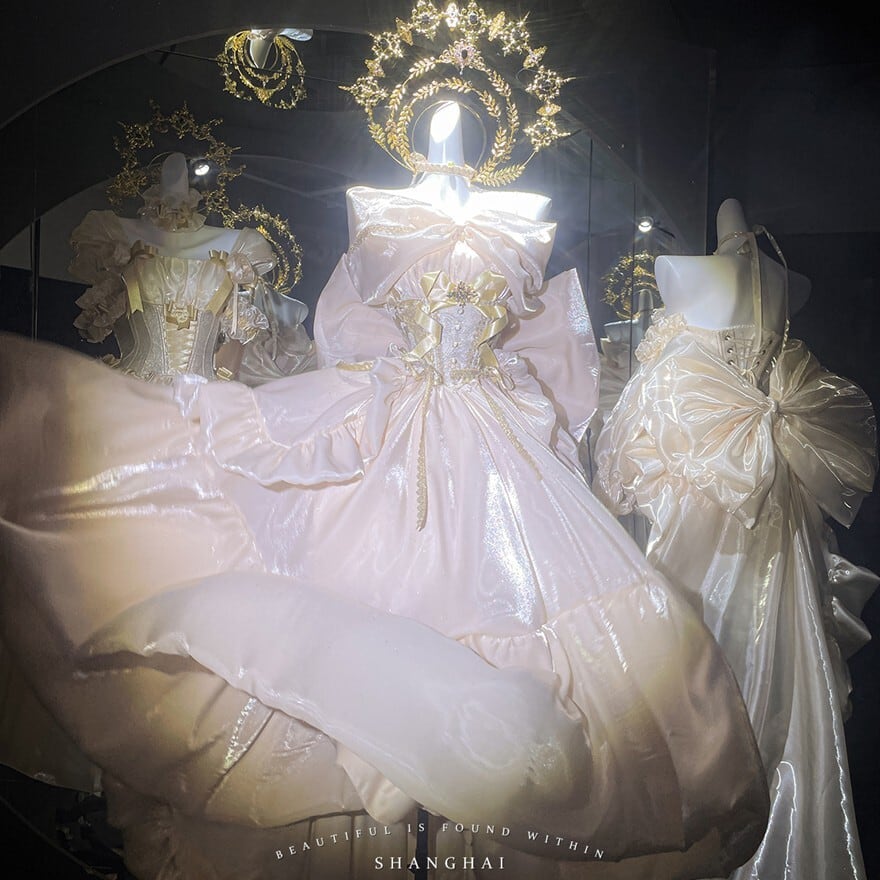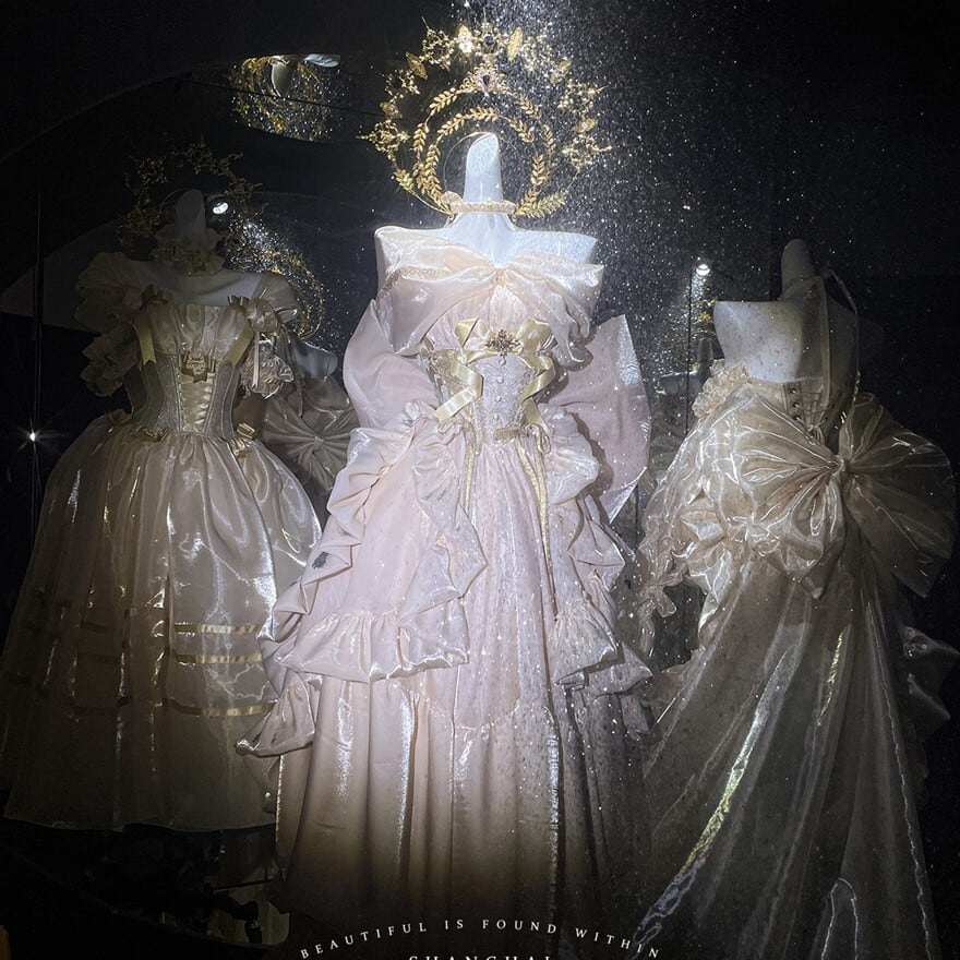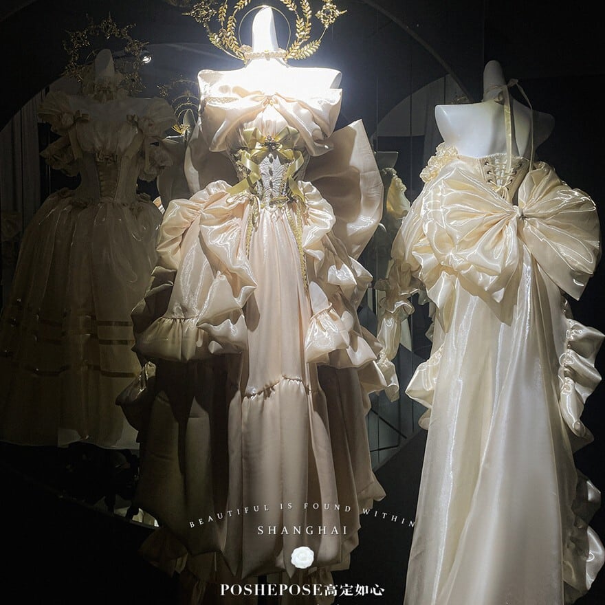 淡いシャンパンゴールドの光沢が、まるで夢の中のドレスのようなロリィタドレスです。大胆なバックリボンとふんわりとしたシルエットが、後ろ姿まで印象的に演出。繊細なレースと胸元の装飾が、上品でクラシカルな雰囲気を醸し出します。特別な日に、あなたを最高に輝かせる一着です。