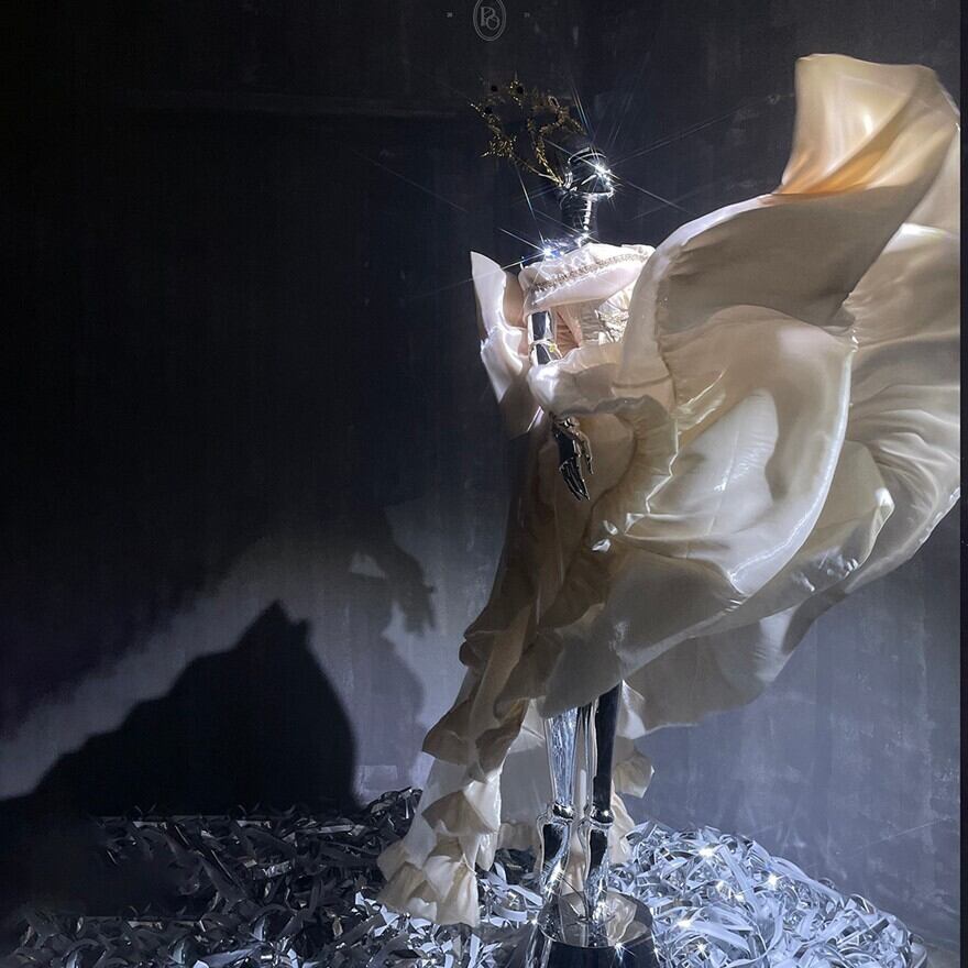 ・光沢のある生地とたっぷりのフリルが、動くたびに優雅なシルエットを描き出します。