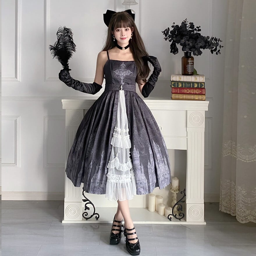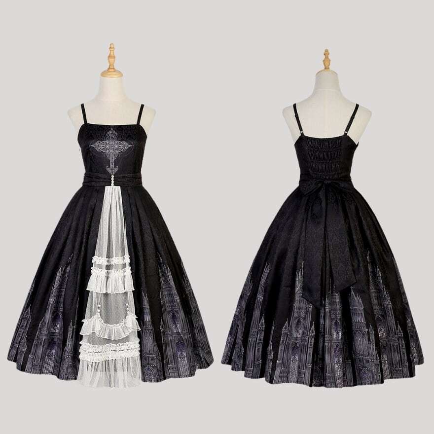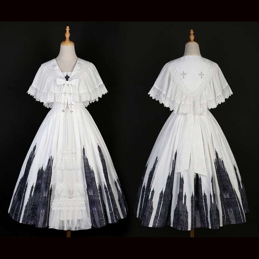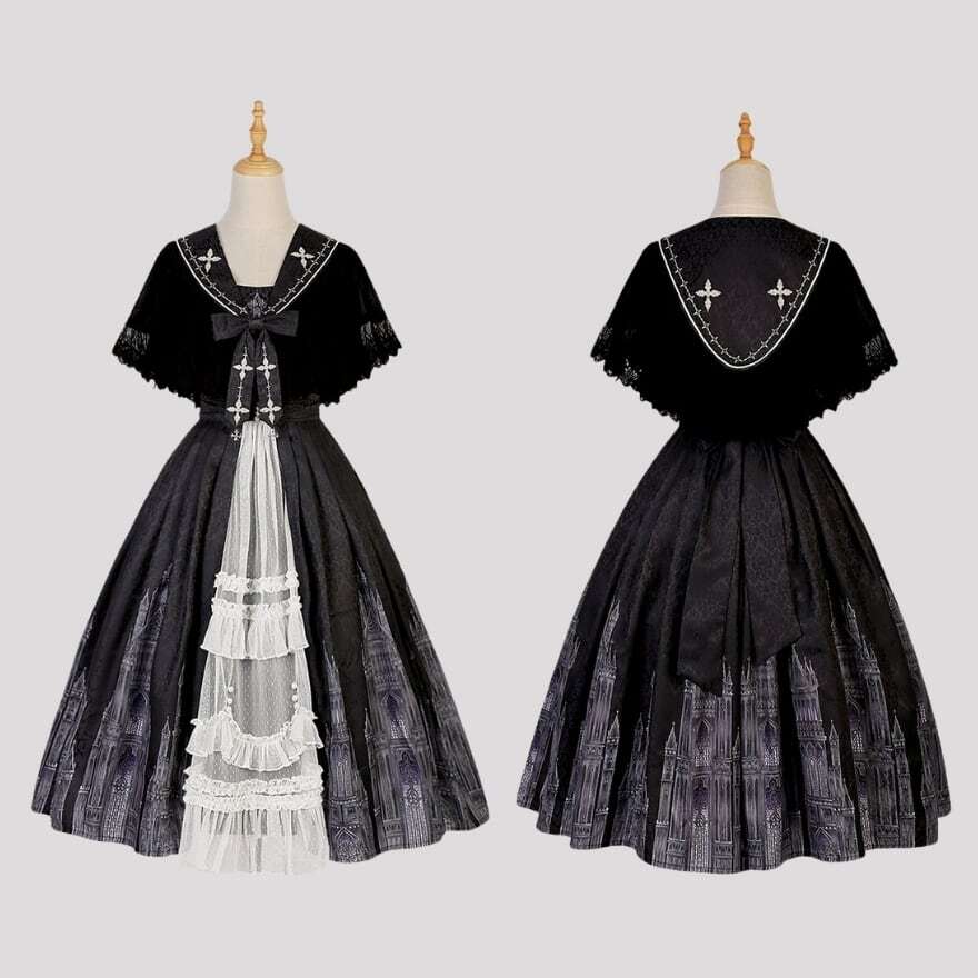 関連キーワード: #ゴスロリ #ゴシックロリィタ #ロリィタファッション #セットアップ #ケープ #ジャンパースカート #JSK #建築柄 #ゴシック建築 #クロスモチーフ #フリル #レース