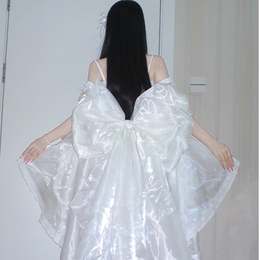 ・後ろにあしらわれた大きなリボンは、ロマンティックなアクセント。繊細な刺繍やパールボタンなど、細部にまでこだわったデザインが、乙女心をくすぐります。