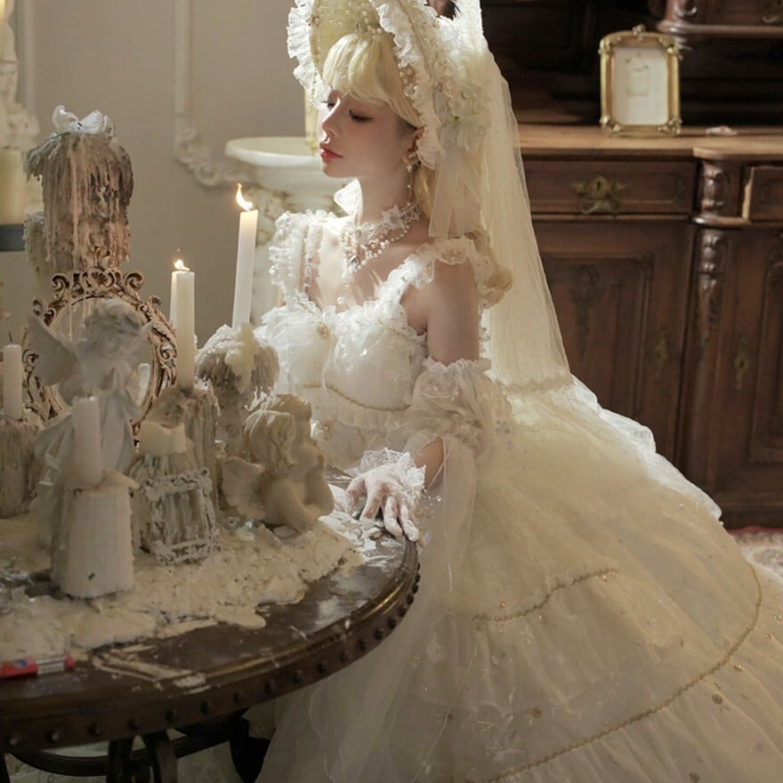 幾重にも重なるフリルと、繊細なレースが織りなすハーモニーは、まるでウェディングドレスのような神聖な美しさ。
