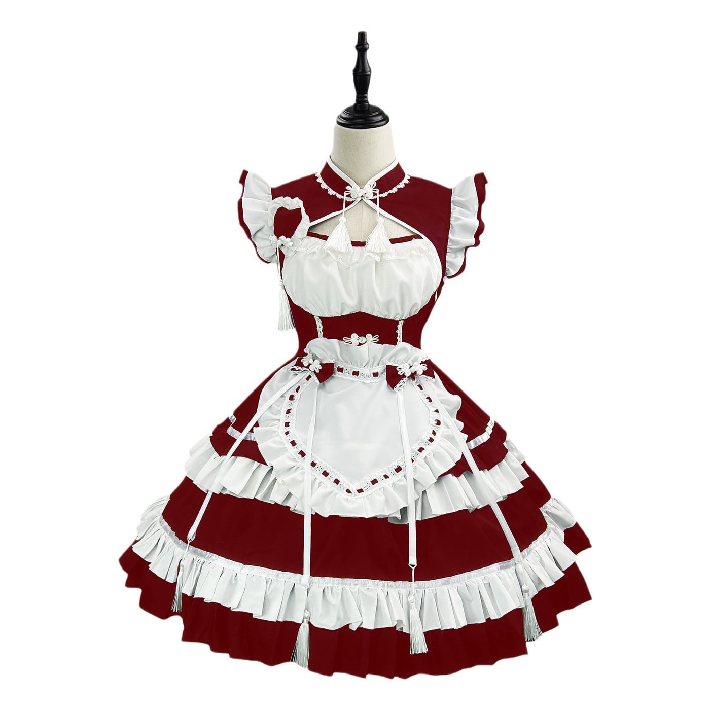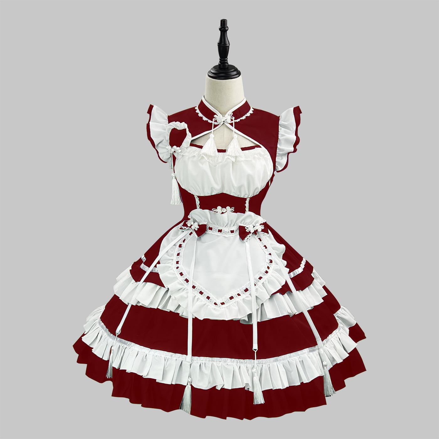 メイド服 中華風 ワンピース エプロン タッセル ヘッドドレス 継袖付き メイドカフェ コンカフェ衣装