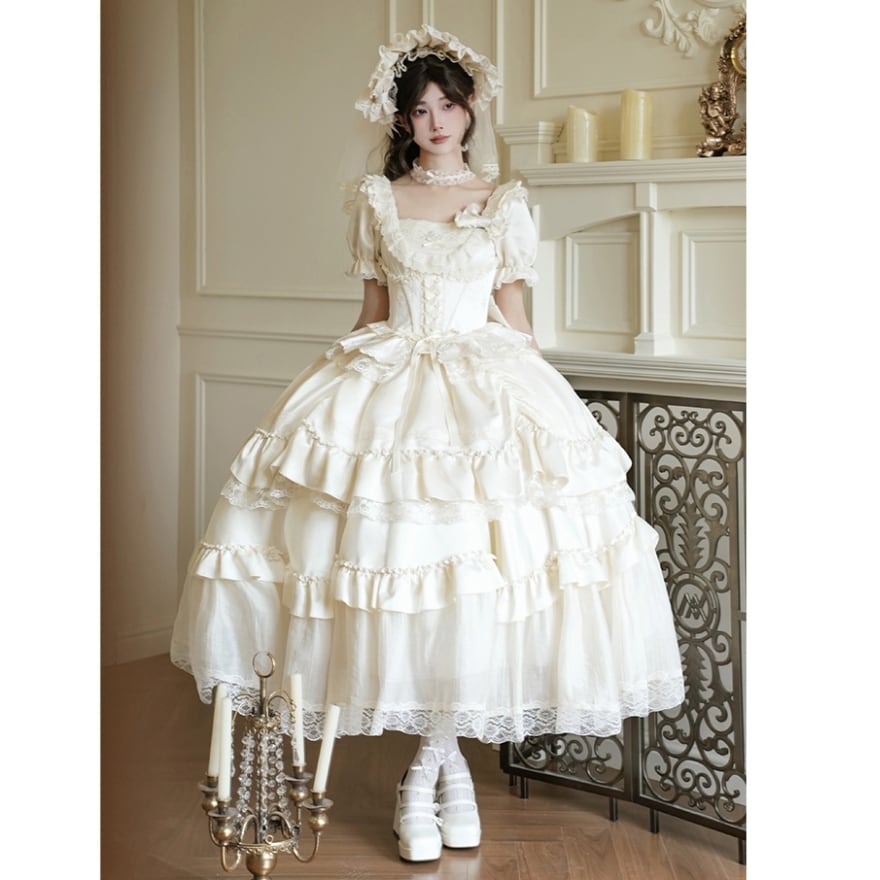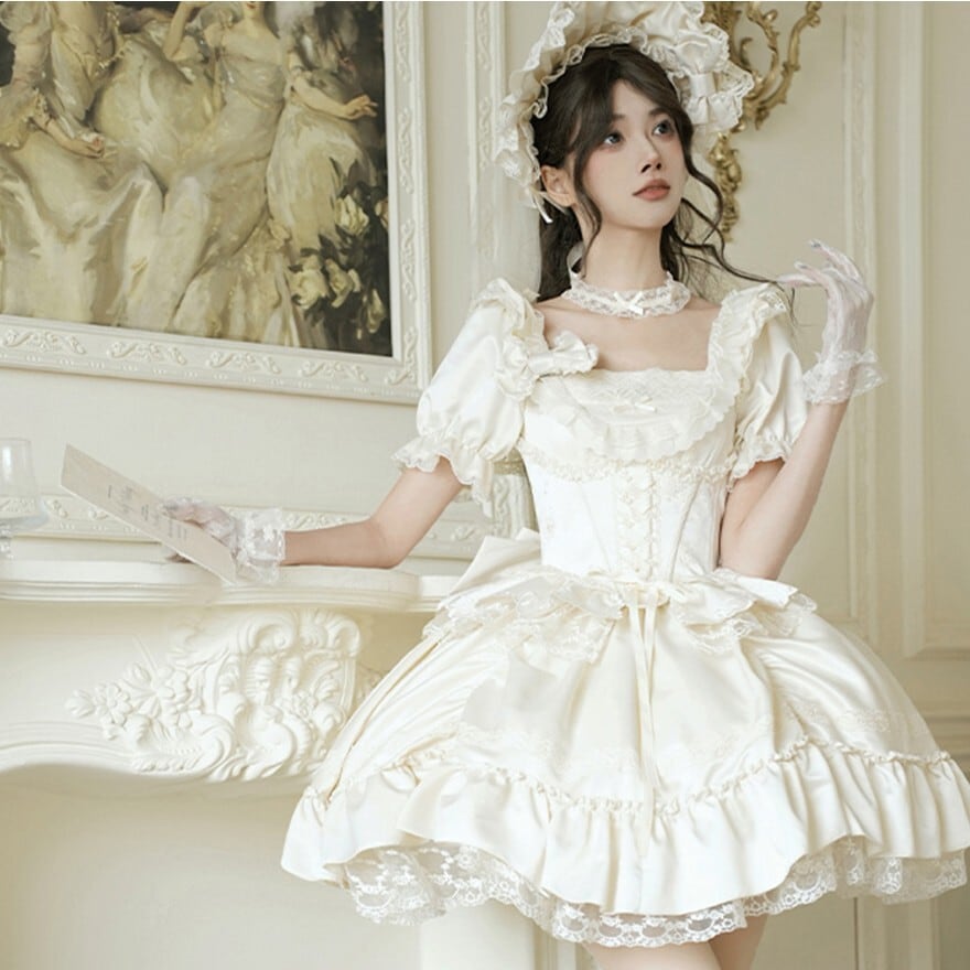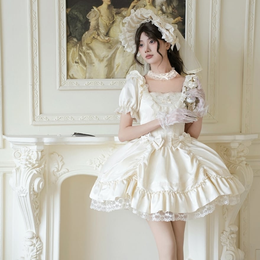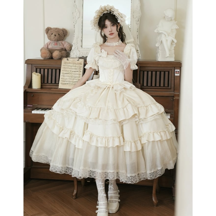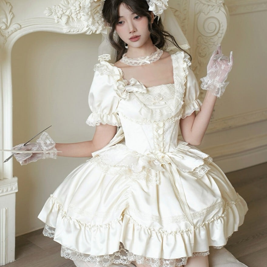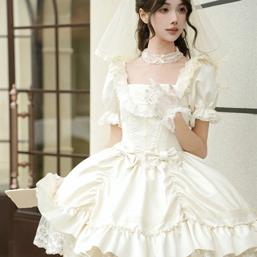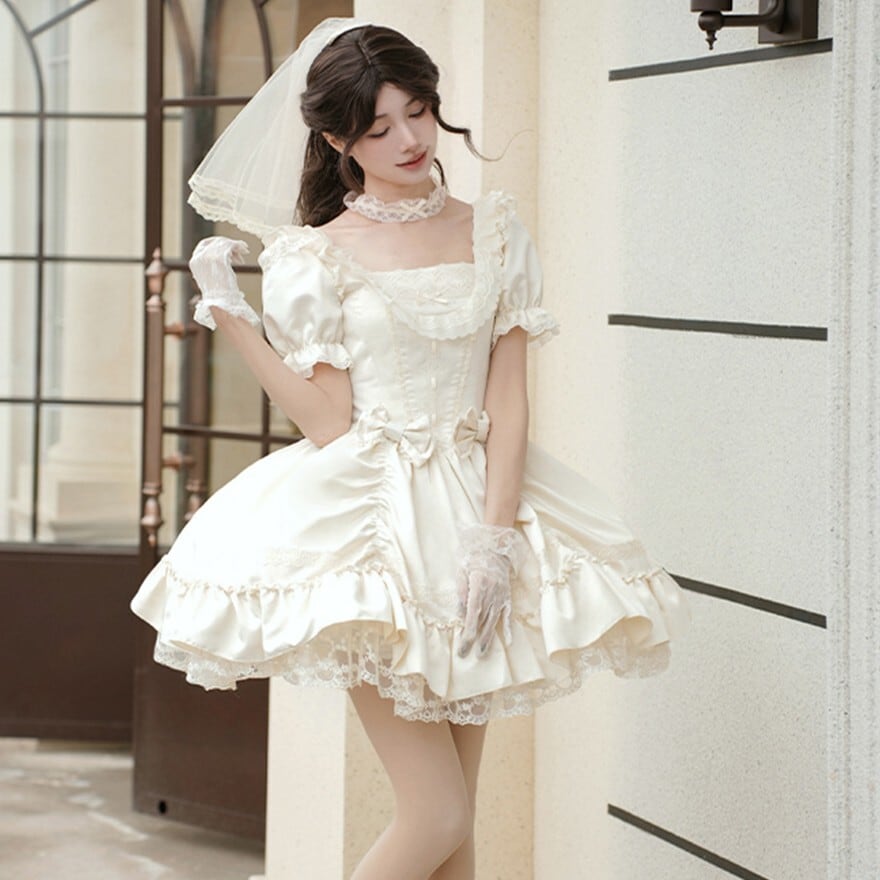 純白の輝きをまとう、ロマンティックなロリィタワンピースと、愛らしいリボン、そして繊細なチョーカーの4点セットです。
