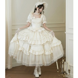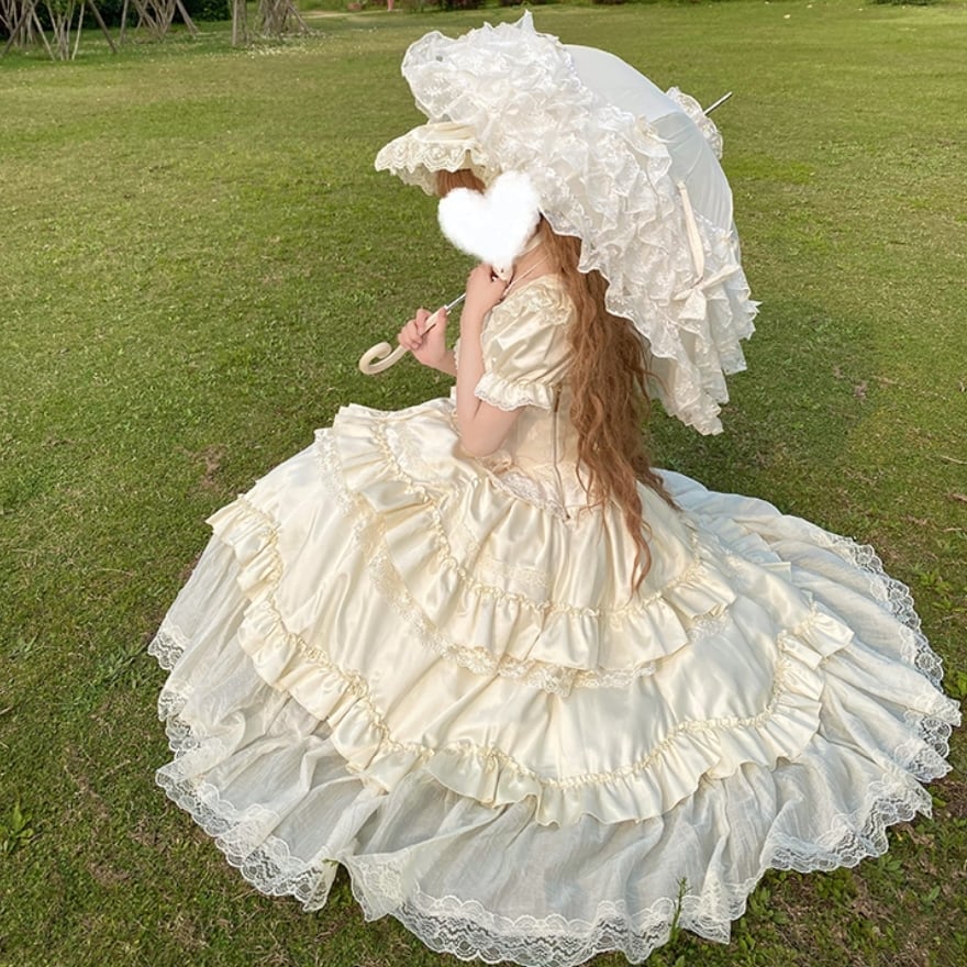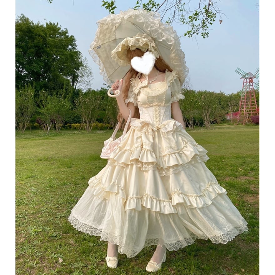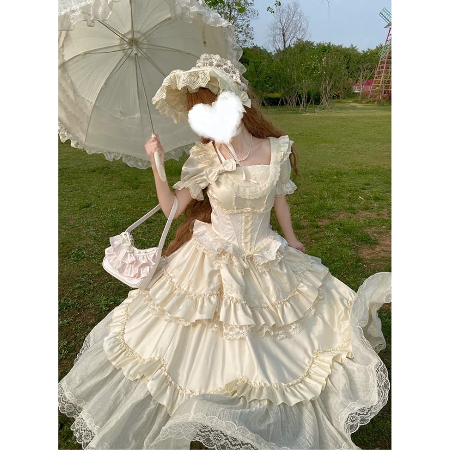 ・ふんわりと広がるスカートのシルエットと、裾や袖口にあしらわれた繊細なレースが、優雅でロマンティックな雰囲気を高めます。歩くたびに軽やかに揺れ、視線を惹きつけます。