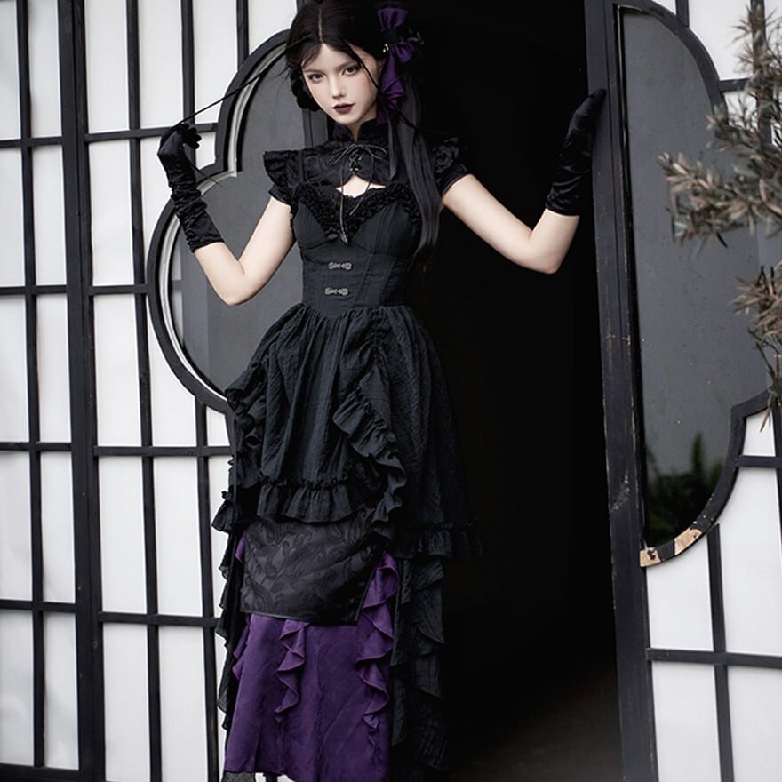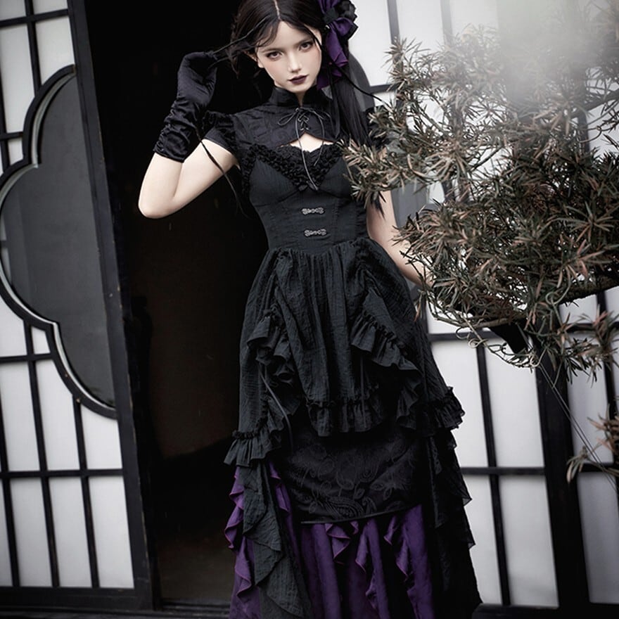 アシンメトリーに広がるスカートの裾には、ティアードフリルがあしらわれ、動きに合わせてドラマティックなシルエットを生み出します。