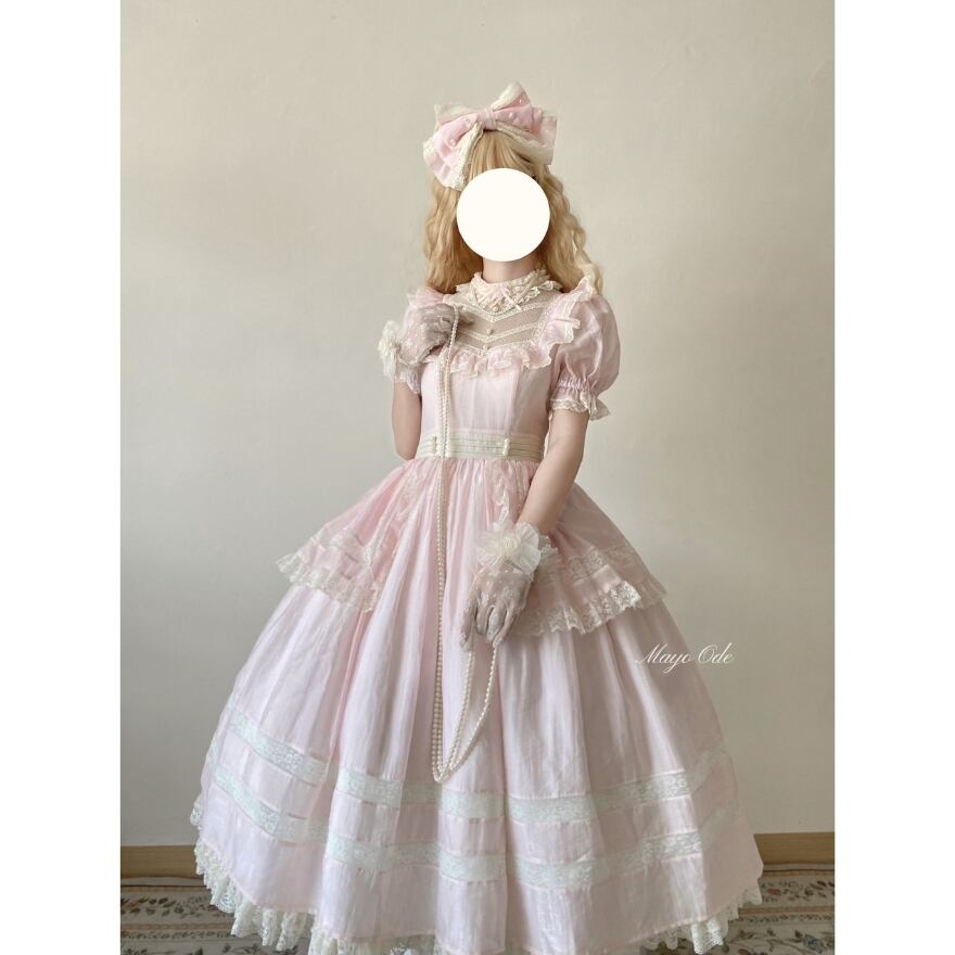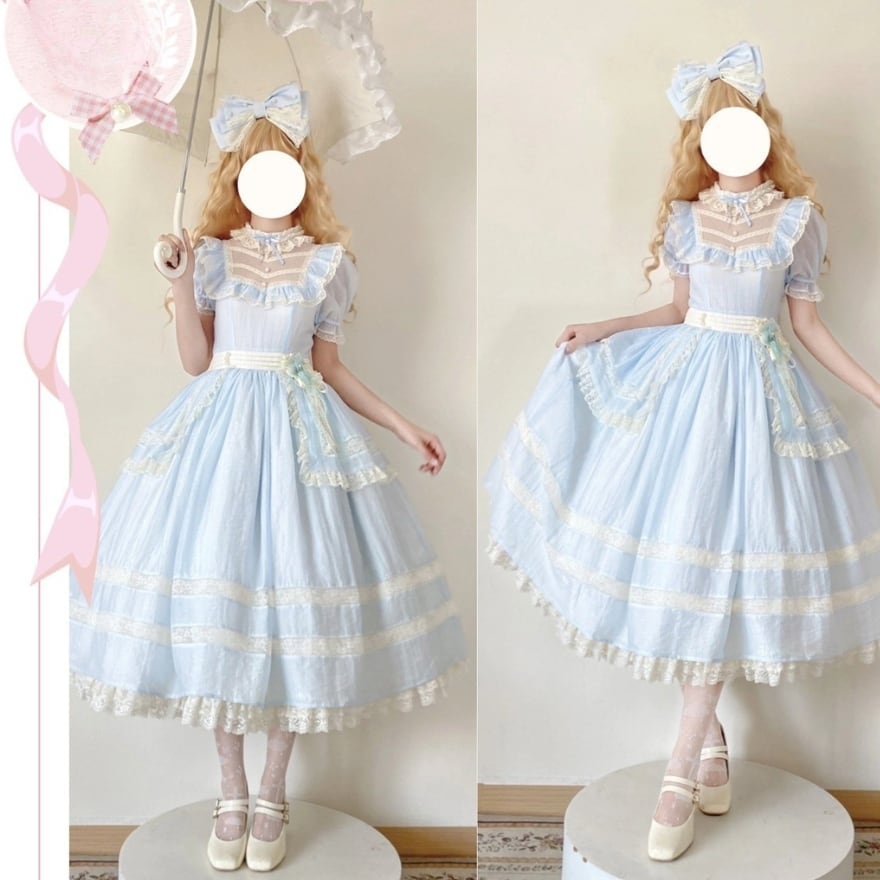 淡いブルーの生地に、オフホワイトの繊細なレースが襟元、袖、スカートのティアード部分にあしらわれた、クラシカルロリータのロングワンピースです。