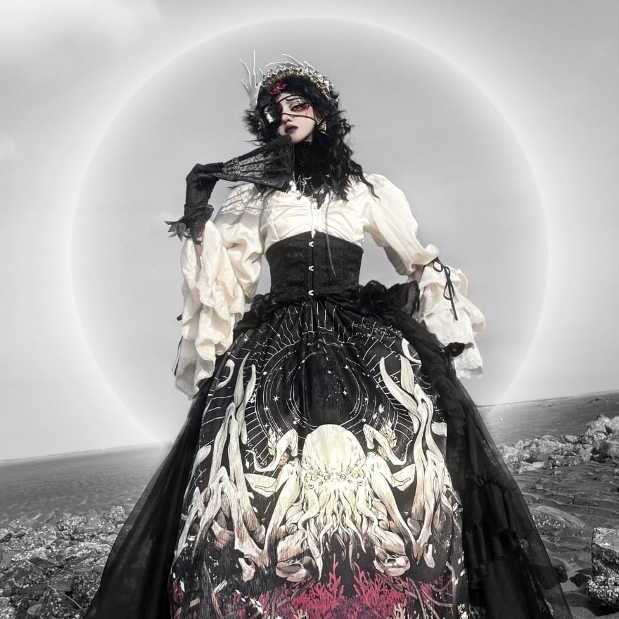 お手持ちのブラウスやワンピースの上に重ねるだけで、いつものコーディネートが一瞬にして、退廃的で美しいゴシックスタイルへと昇華します。