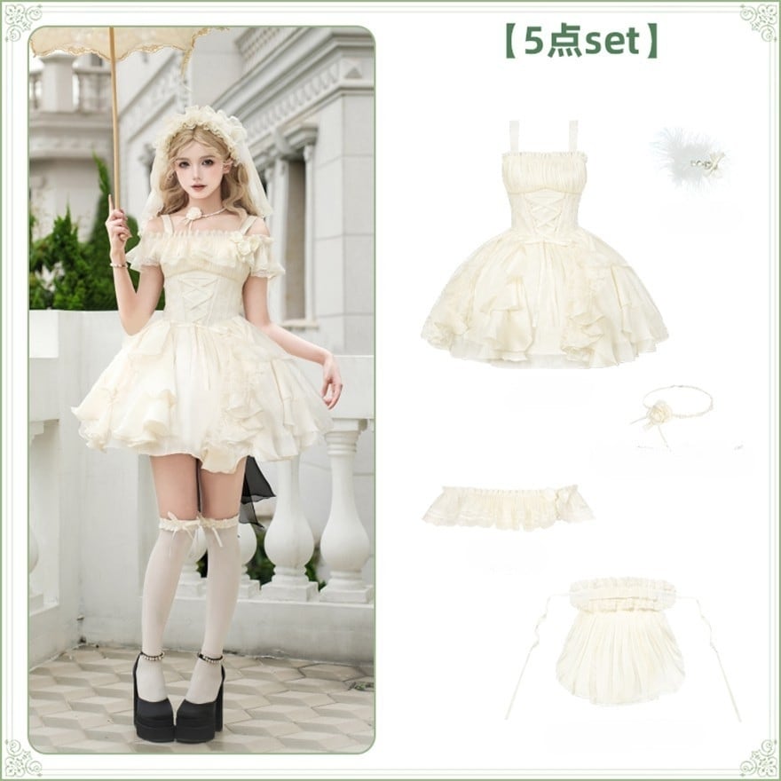 ふんわりと広がるスカートと繊細なレース、そして上品な光沢感が、見る人の心を奪う、とっておきのロリィタドレス5点セットです。