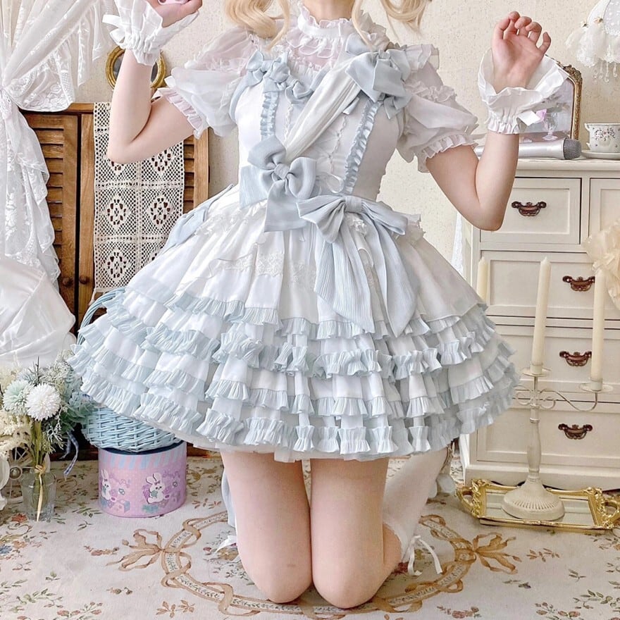 淡いミントブルーとホワイトの組み合わせが、まるで絵本から飛び出してきたような夢見るロリィタセットアップです。