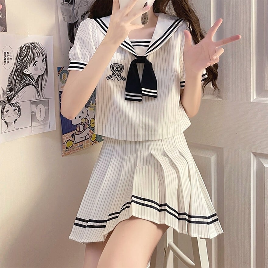 清楚で爽やかな印象を与える、白を基調としたセーラー服風セットアップです。