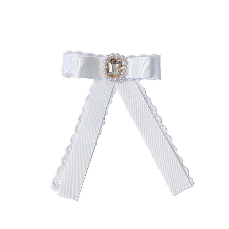 セットのリボンタイは、オフホワイトのリボンにパールとラインストーンの装飾が施されており、上品さを添えます。