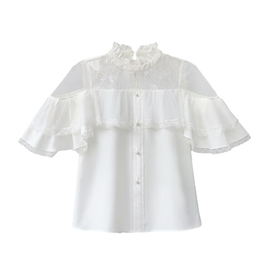 トップスは、スタンドカラーにフリルがあしらわれ、胸元と肩部分に繊細なレースとシアー素材が使用されています。オフショルダーのデザインで、袖口にもフリルが配されており、清楚で可愛らしい印象です。