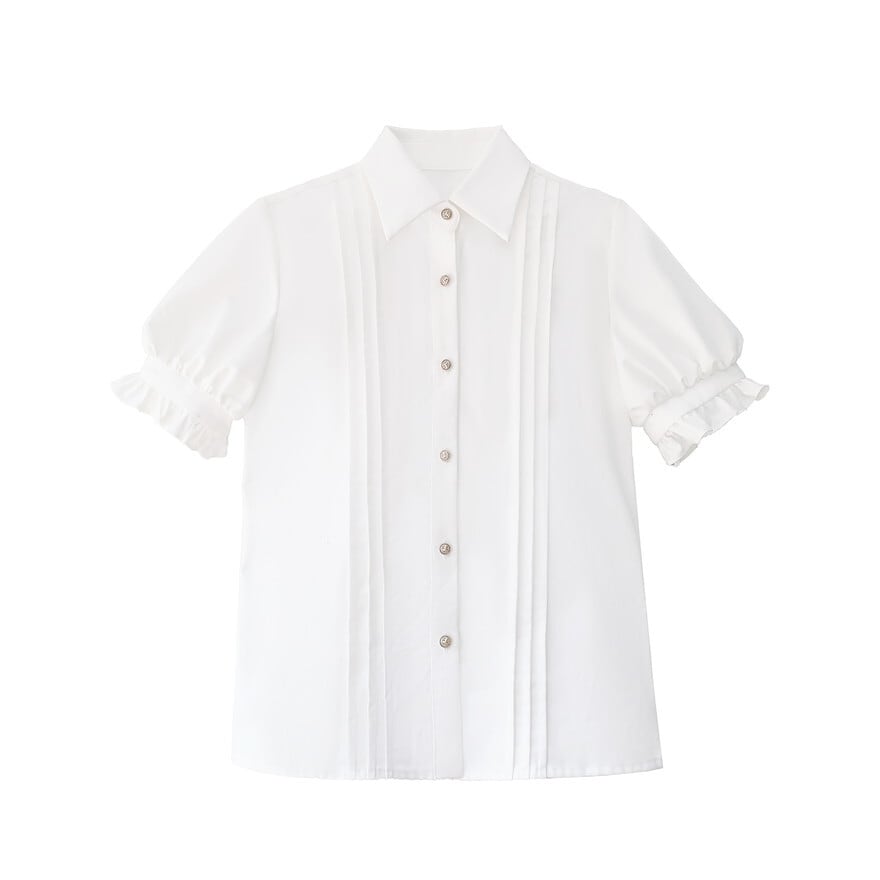 ブラウスは、シンプルなレギュラーカラーに、前立てにプリーツが施されたデザイン。袖はパフスリーブで、袖口にはフリルがあしらわれており、上品な可愛らしさを添えています。