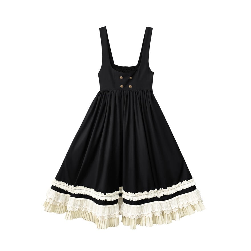 ジャンパースカートは、ブラックのしっかりとした生地で、肩紐と胸元に施された金色のボタンがアクセントになっています。