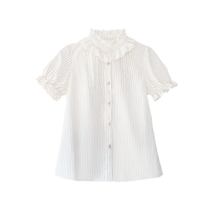 ブラウスは、アイボリー地に細いストライプが入った生地で、スタンドカラーにはフリルがあしらわれています。袖はふんわりとしたパフスリーブで、袖口にもフリルが施されており、可愛らしい印象です。