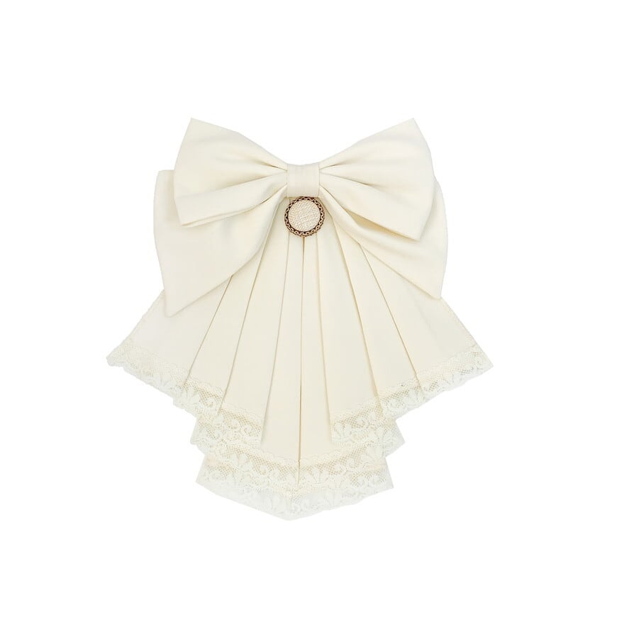セットのボウタイは、クリーム色の大きなリボンと折りたたまれたフリル状のデザインが特徴で、中央にはレトロな雰囲気のエンブレムが配されており、クラシカルな装いを一層引き立てます。